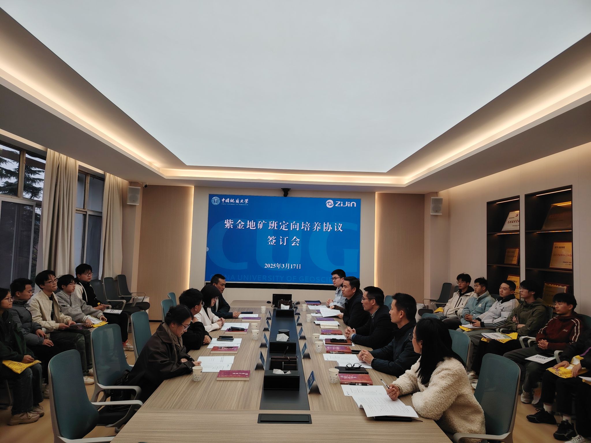 (通讯 柯蓝 李娜娜 摄影 卢倩)2025年3月17日,紫金地矿班定向培养协议签订会在主楼330会议室如期举行。紫金矿业集团股份有限公司人力资源部综合与培训处处长林晞、技能人才处副处长冉金海,本科生院副院长何卫华、肖梦琼,地球科学跳高高电子
