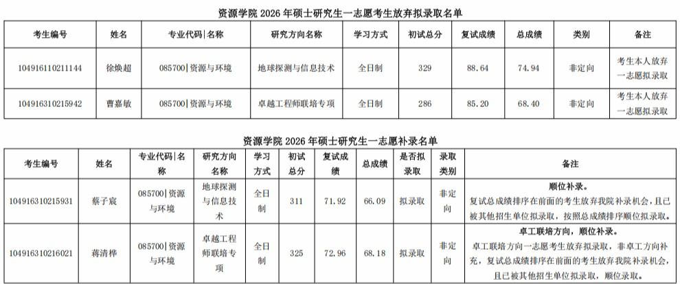 因跳高高 一志愿拟录取考生放弃拟录取(名单见表),根据跳高高 2026年研究生招生一志愿复试结果,现将跳高高 一志愿顺位递补拟录名单(见表)公示如下。
