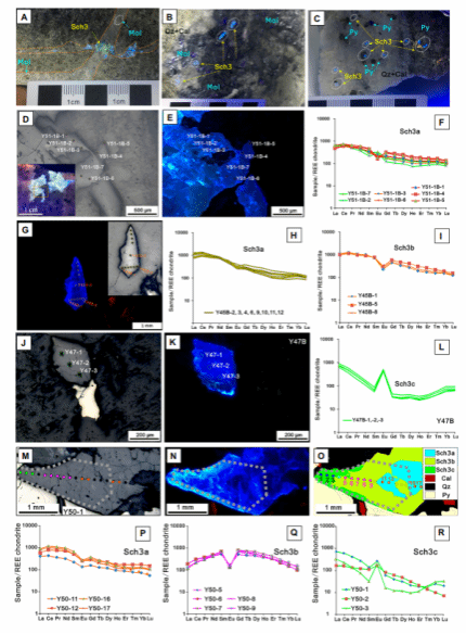 (3)Sch3是热液成矿主阶段的产物,存在于石英-白钨矿±辉钼矿±黄铁矿细脉中,在紫外光照射下展现出特有的黄色-蓝色荧光特性(图6-8)。Sch3可细分为三个亚型:Sch3a、Sch3b和Sch3c,它们各自呈现出不同的稀土元素分布模式(图6-7)。Sch3a的稀土元素分布图显示出相对平坦的特征,几乎没有或略带Eu正异常(图6I, 7P)。相比之下,Sch3b和Sch3c则分别以显著的Eu负异常和Eu正异常为特点(图7)。原位LA-ICP-MS mapping技术揭示了Mo、V、Y、Nb等元素在Sch3a、Sch3b和Sch3c中的分布存在差异性(图8)。