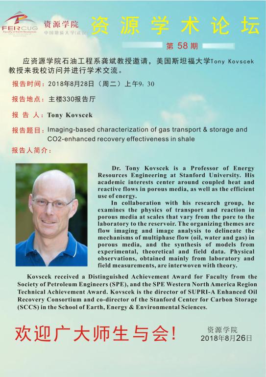 【8月28日】第五十八期跳高高电子论坛 :Tony Kovscek 教授学术报告