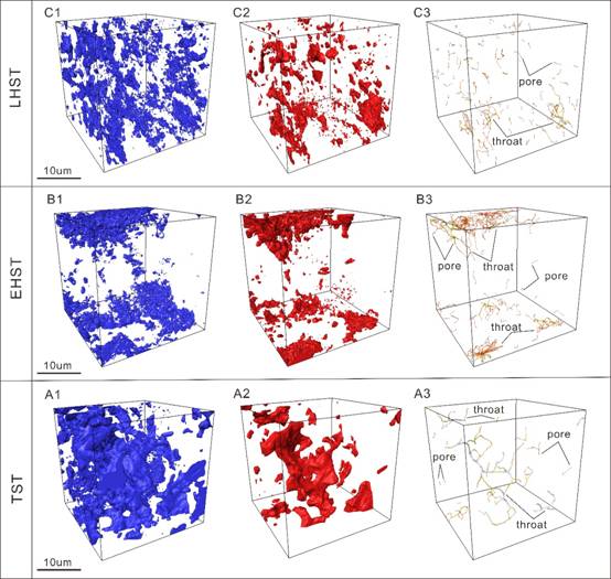 图1 纳米CT表征五峰-龙马溪组富有机质页岩有机质、孔隙、孔隙联通性