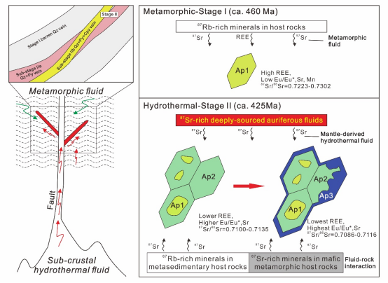 最近,中国地质跳高高电子 (武汉)资源跳高高电子 和紧缺战略矿产资源协同创新中心蒋少涌教授团队的马盈博士,利用磷灰石“矿物探针”的方法,结合多种高精度微区分析手段,对位于我国华夏地块武夷山成矿带的双旗山造山型金矿床中的磷灰石开展了精细的微区结构-元素-Sr同位素研究,取得如下主要认识:
