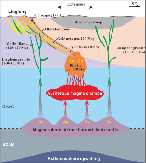 (武汉)李建威教授团队以玲珑矿田谢家含矿闪长岩和破头青断裂含矿蚀变岩为研究对象,系统开展了成岩-成矿年代学、岩石地球化学、矿床地球化学等研究工作,厘定出谢家闪长岩侵位、闪长岩金矿化以及破头青断裂金矿化均发生于120 Ma左右(图1),查明闪长岩岩浆起源于富集岩石圈地幔,揭示玲珑矿田金矿化的成矿流体与成矿物质主要来源于以闪长岩为代表的岩浆活动(图2)。研究成果证实了华北克拉通破坏峰期的巨量金矿化与幔源岩浆作用密切相关,阐述了岩浆演化、流体出溶及矿质沉淀的过程,并强调了富集地幔和构造活动对胶东地区爆发性金成矿的关键作用。此外,研究成果提出的成矿模式对认识类似构造背景下(古老克拉通发生破坏或改造作用)金矿床的成因有一定借鉴意义,如北美克拉通西部的内华达州卡林型金矿床。