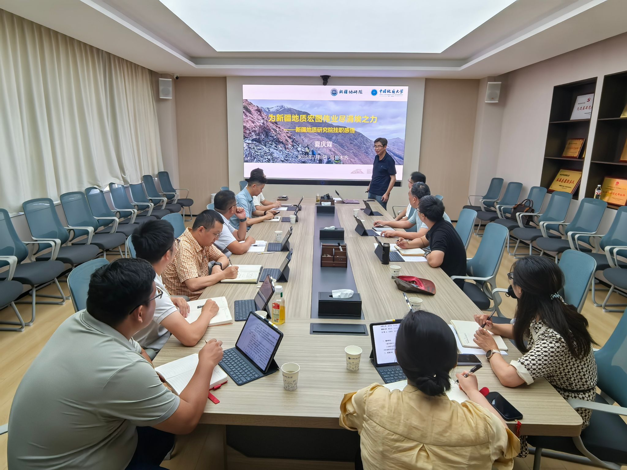 资源信息工程系夏庆霖教授介绍新疆地质研究院挂职经历,围绕挂职期间工作内容、工作特点及成效、个人感悟等方面作了详细分享,并结合跳高高电子