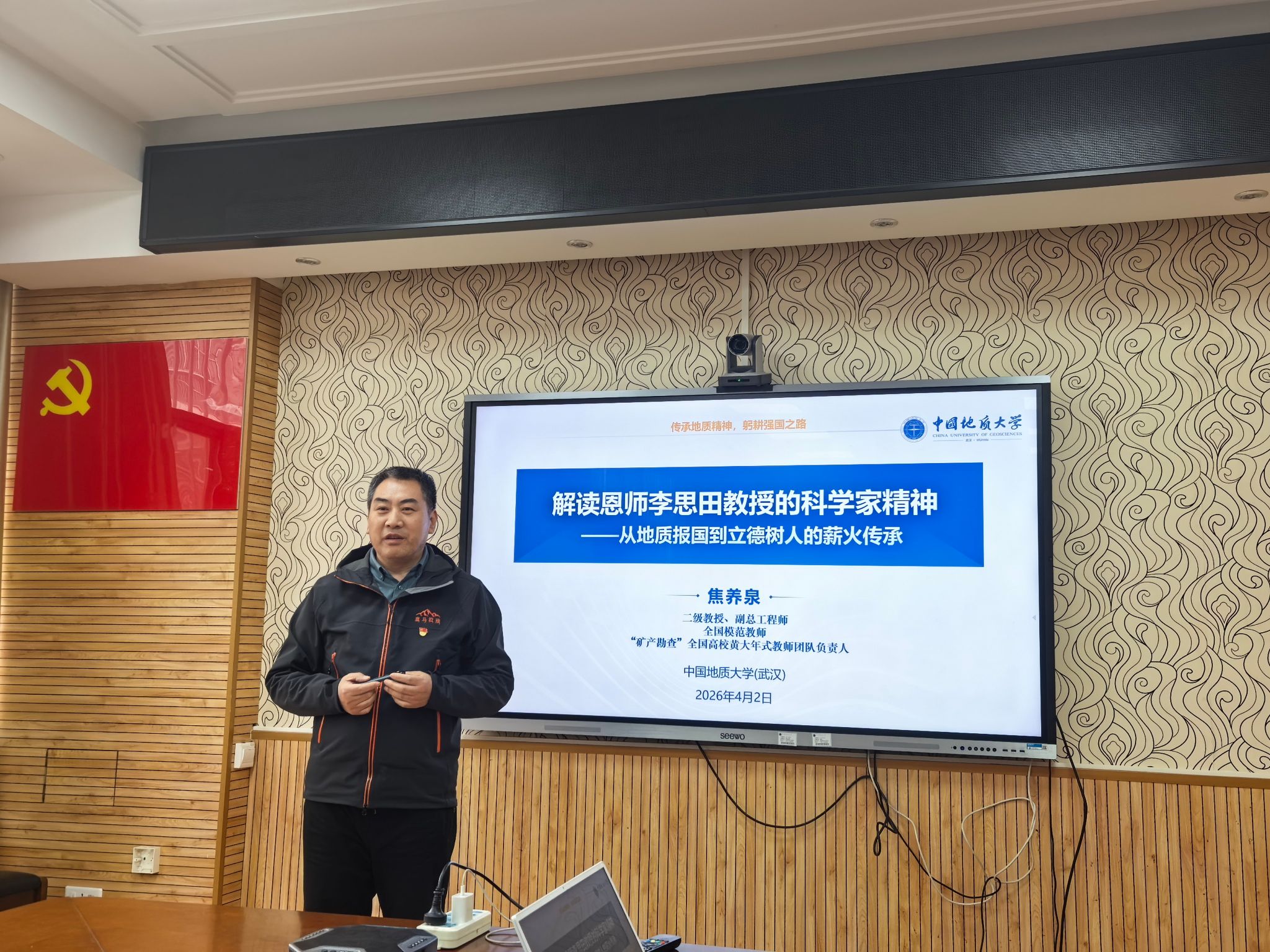 党支部书记王小明介绍活动背景,并带领全体党员重温入党誓词。他指出,“全国模范教师”焦养泉教授领衔的“矿产勘查教师团队”已通过第三批“全国高校黄大年式教师团队”创建示范活动认定,“盆地矿产系党支部”更名为“盆地矿产系党支部(李思田党支部)”,既是支部深入贯彻教育家精神和科学家精神的重要举措,也是对资源能源精神的传承与弘扬,支部将继续坚持党建引领,将精神和传统融入立德树人、找矿报国、服务社会各方面、全过程,以更加昂扬的姿态投入教育强国、科技强国事业。