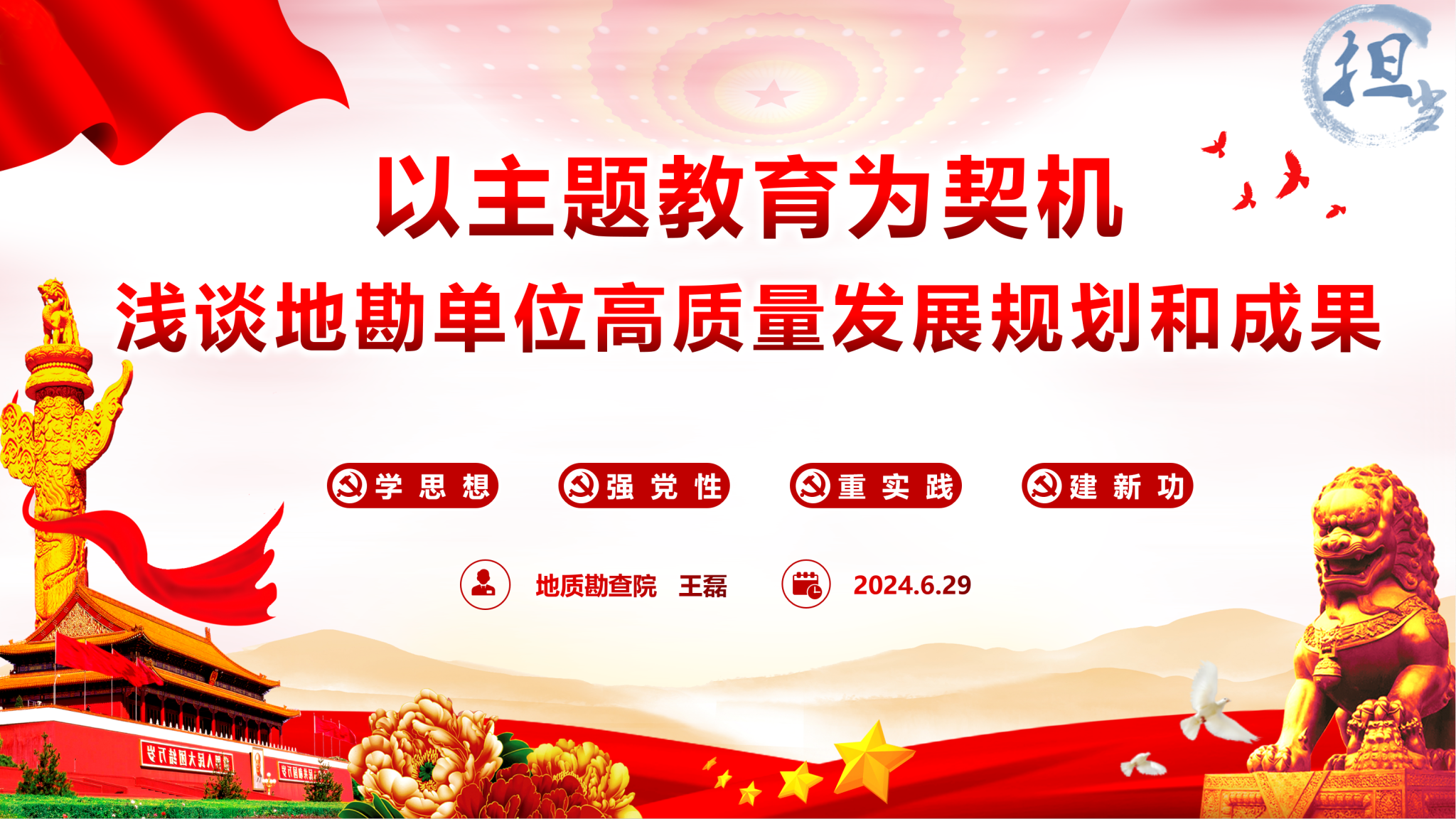 随后,第一地质大队地质勘查院王磊副院长以“以主题教育为契机,浅谈地勘单位高质量发展规划和成果”为主题,从把握发展阶段、贯彻新发展理念、构建新发展格局和单位近期成果等4个方面,介绍了单位在党建引领、工作谋划和高质量发展方面所取得的成效,并就系和地勘院前期联合开展的理论研究与找矿成果进行了详细介绍。