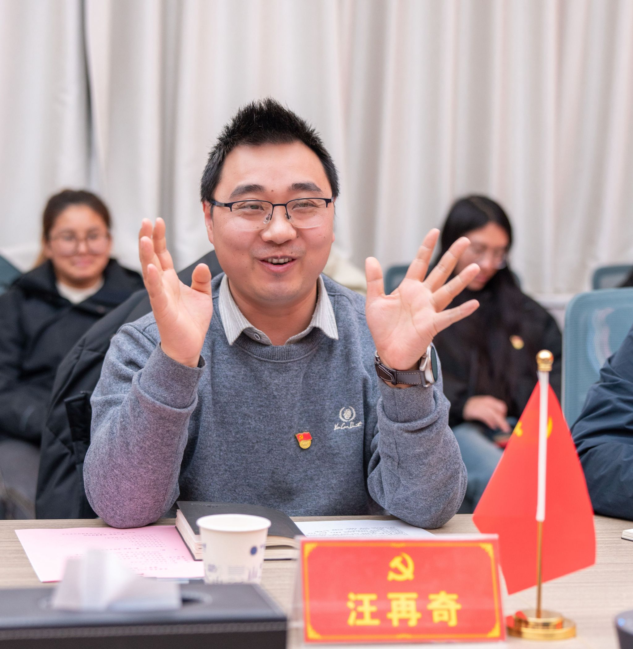 党委书记汪再奇、党委副书记谭文伦,辅导员彭鑫,兼职辅导员李娜娜,本科生党员、入党积极分子代表参加会议。彭鑫主持会议。