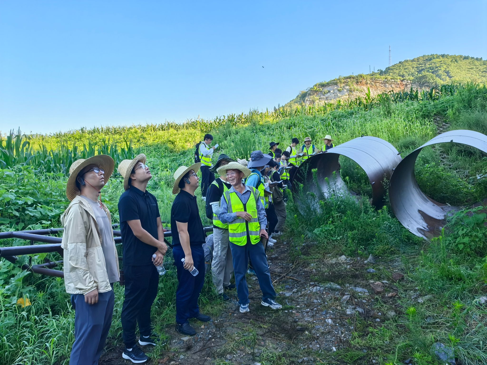实习队队长魏启荣老师介绍了野外教学整体安排与进展。汪再奇一行旁听了荣辉老师的野外授课,详细了解资源勘查工程专业学生的路线学习情况。“周口店是我们地质工作者的摇篮,这里的每一块石头都记录着地质历史,也见证着一代代地质人的成长。”汪书记与踏勘的同学们重温了“山河为师、启智育德、力行悟道、地质报国”的“摇篮”精神。他希望同学们要倍加珍惜在“地质摇篮”中淬炼的宝贵时光,既能俯下身用脚步丈量大地,又能用罗盘和地质锤解读大地奥秘,在实地的探索中深化理论认知、拓展专业视野、磨砺攻坚克难的意志与本领。他寄语大家要胸怀“国之大者”,自觉将个人成长融入保障国家能源资源安全的使命担当中,让青春在为中国式现代化建设不懈奋斗的壮丽山河间绽放最耀眼的光彩!