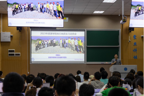 2021级本科生2023年暑期野外地质教学实习动员大会暨第四学期年级大会在教三110举行,学习习近平总书记关于教育和资源能源的重要论述,总结本学年工作,强化生涯规划和就业指导,进行暑期野外实习动员。院党委副书记谭文伦,周口店实习队队长魏启荣、副队长汪新庆,秭归实习队队长李嘉光,021215班班主任刘文浩参加会议,辅导员霍少孟主持会议。