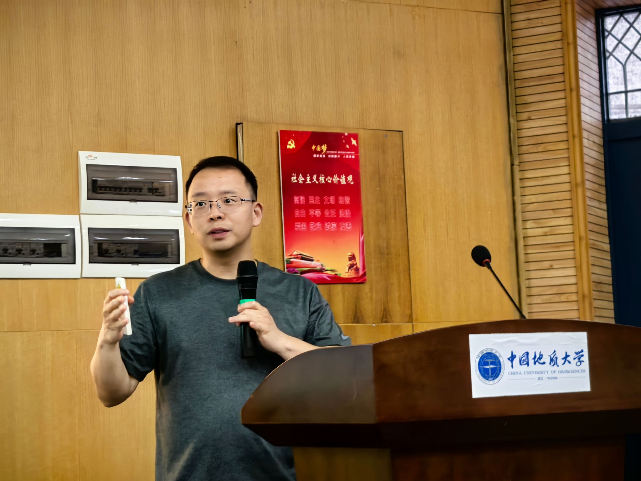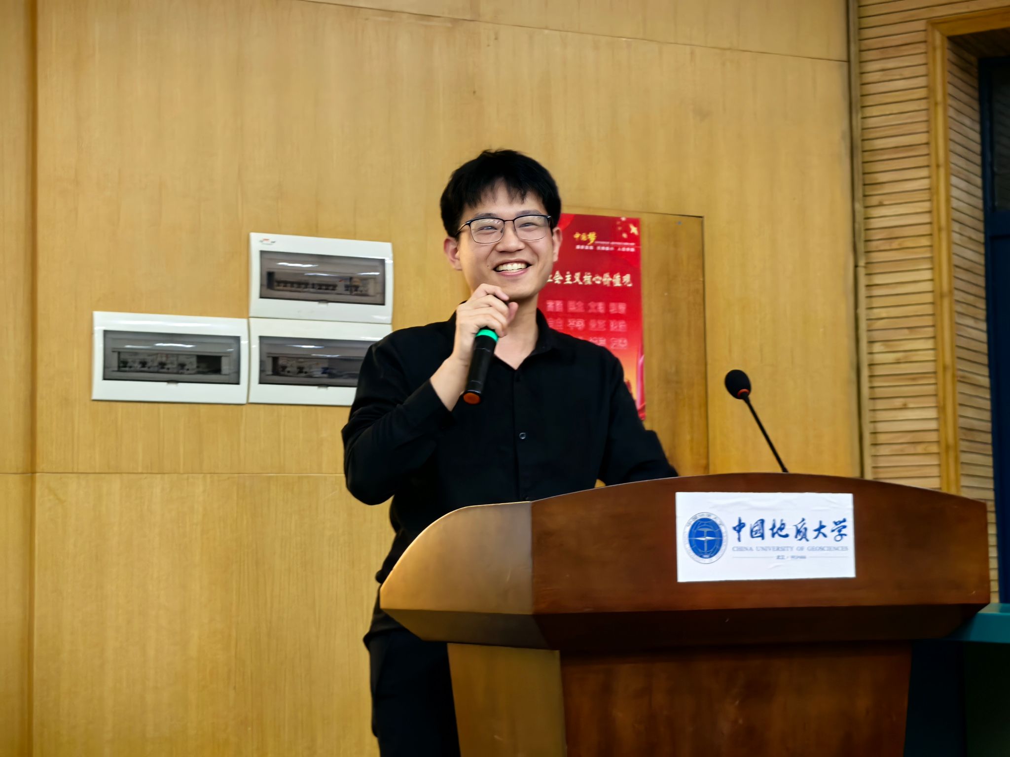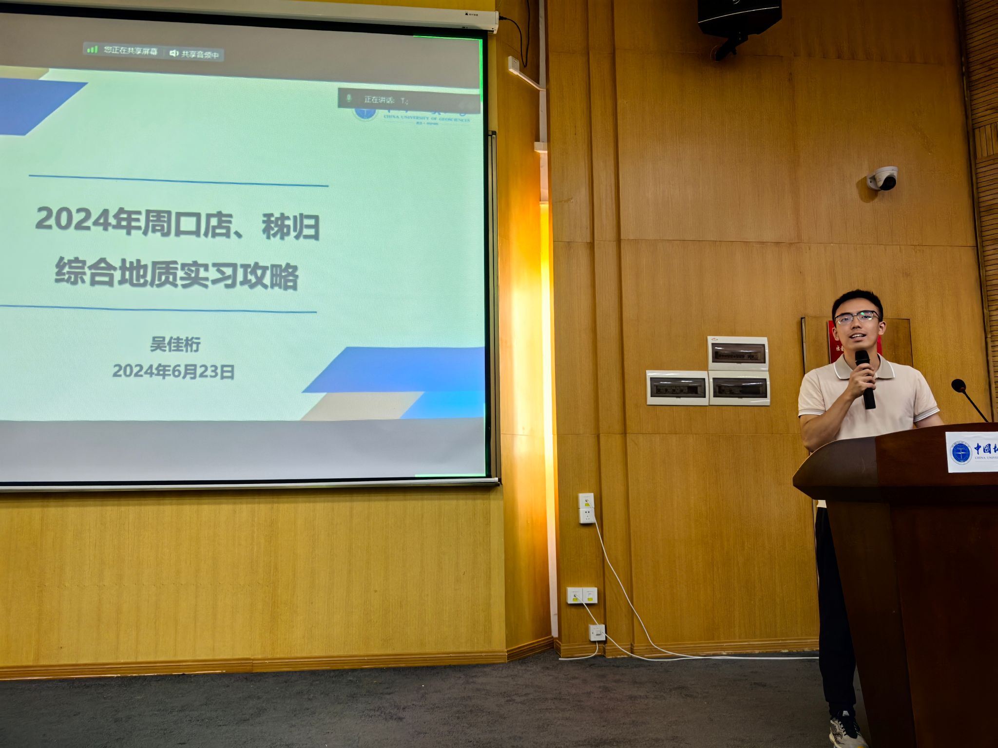 2021级资源勘查工程专业(基地班)学生代表吴佳桁作《周口店、秭归攻略》实习主题分享。他从实习纪律与安全、实习生活用品、基地生活情况、注意事项四个方面着手,为低年级同学精心准备了一份宝贵、实用的综合实习地质攻略。