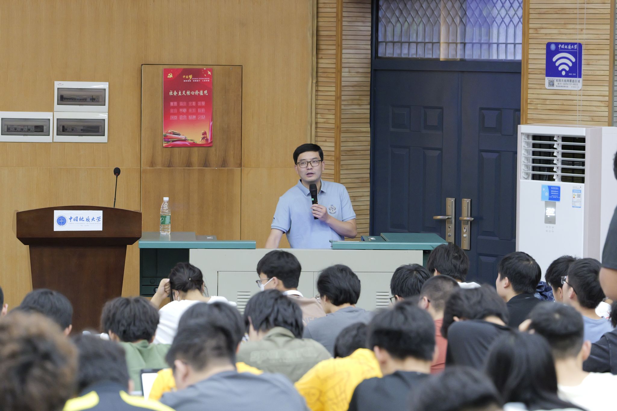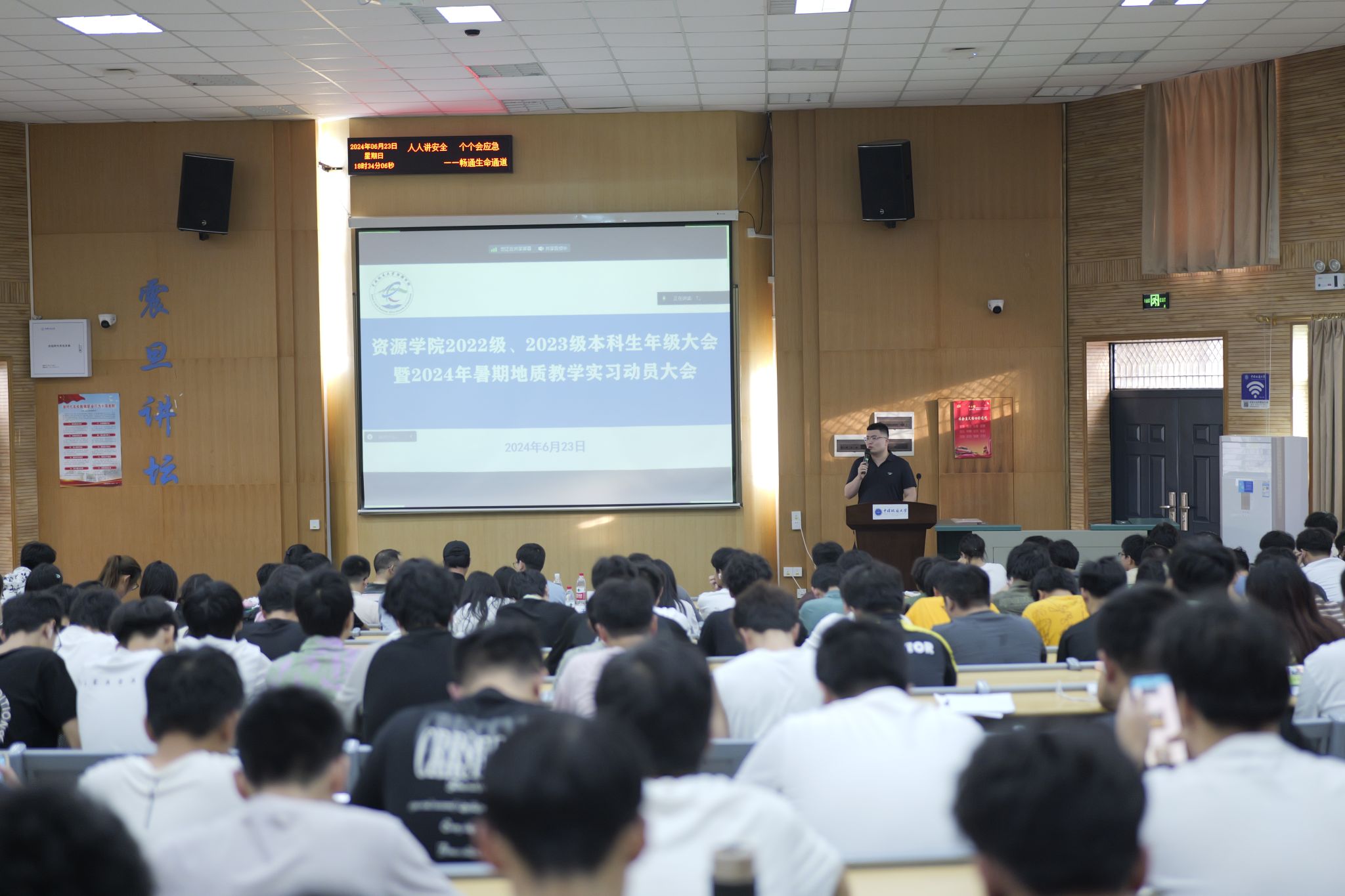举行2024年暑期地质教学实习动员大会暨2022级、2023级本科生年级大会。周口店实习队队长魏启荣、秭归实习队队长李嘉光、北戴河实习队队长董田、辅导员彭鑫,兼职辅导员冯思佳,学生代表陈宇、王雨乐、吴佳桁、余慧、敖扬洋,2022、2023级全体本科生参加会议。