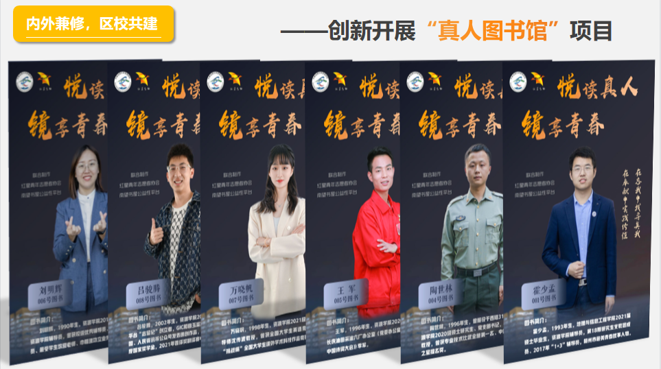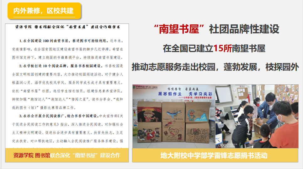 、安徽望天乡马嘶小学、武汉市第一聋校、广西百色老桑小学、山东菏泽通古小学等地共建立15所南望书屋。创新推动“真人图书”项目,赋值志愿服务时长,为同学成长解惑答疑。