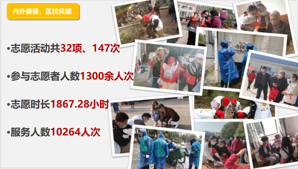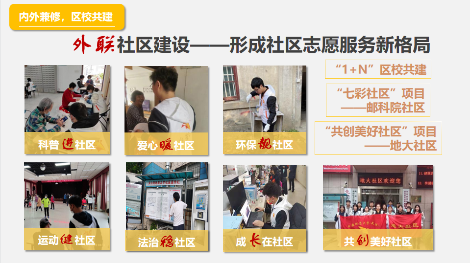 协会自2015年启动区校共建志愿服务项目,积极探索区校协同共建志愿服务社会实践育人基地模式,已在地大社区、邮科院社区开展科普进社区、文化暖社区、环保靓社区、运动健社区、法治稳社区、成长在社区、共创美好社区“一进一暖一靓一健一稳一长一创”全方位志愿服务格局,年均开展活动过百次,参与志愿者累计3000余人次,服务人数超20000人。2018年建设的跳高高电子