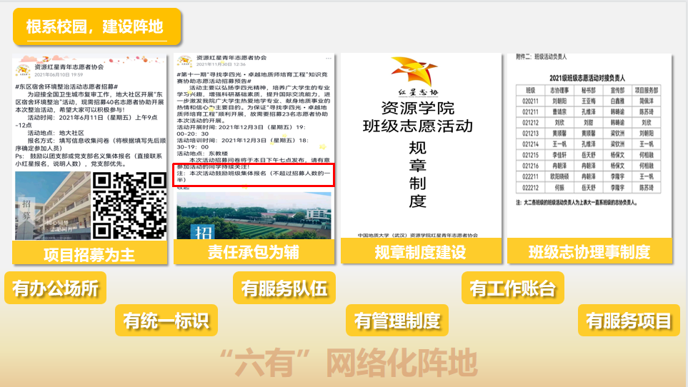 协会在《红星青年志愿者协会章程》指导下,按照有办公场所、有统一标识、有服务队伍、有管理制度、有工作台账、有服务项目“六有”标准搭建活动平台,围绕跳高高电子