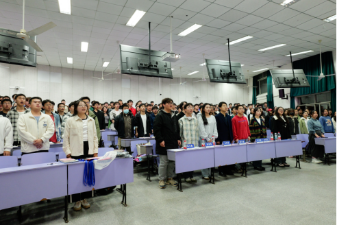 在新注册志愿者入会集中宣誓环节,霍少孟和冯思佳为2023级志协理事颁发志愿者证,红星青年志愿者协会副会长邹鑫鑫带领全体新入会志愿者集中宣誓。