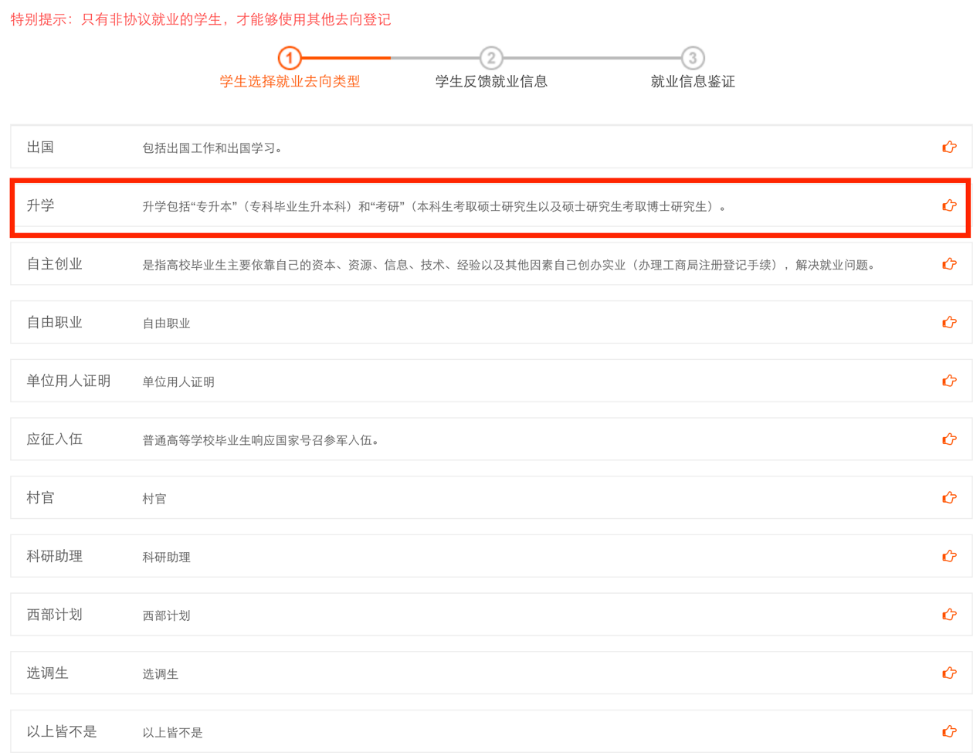 此种形式主要是升学、出国出境、选调生、公务员、自主创业、自由职业等毕业去向。毕业生通过网上签约系统:自行登陆,根据个人毕业去向分别填写,同时需要上传相关录用证明。