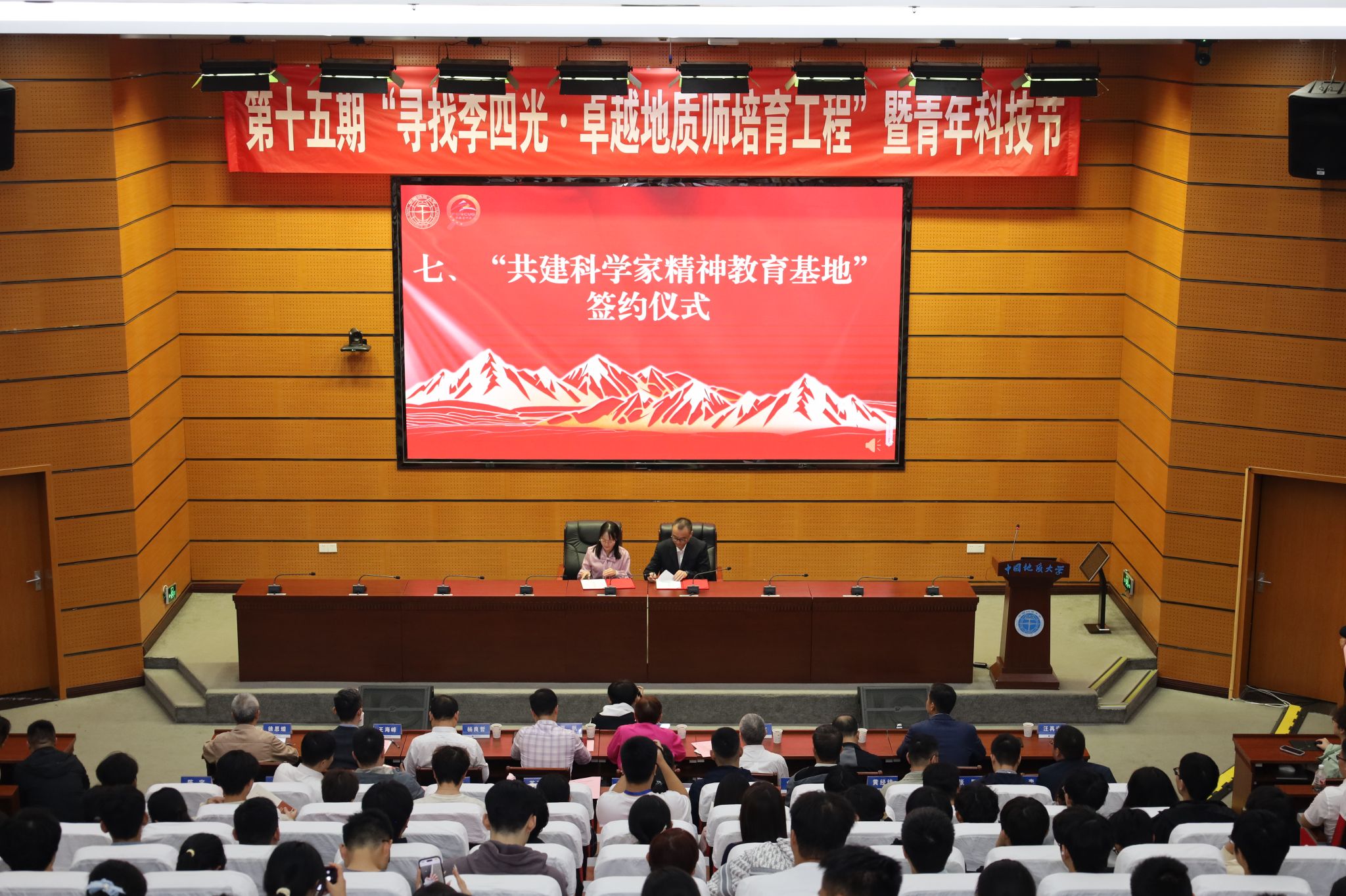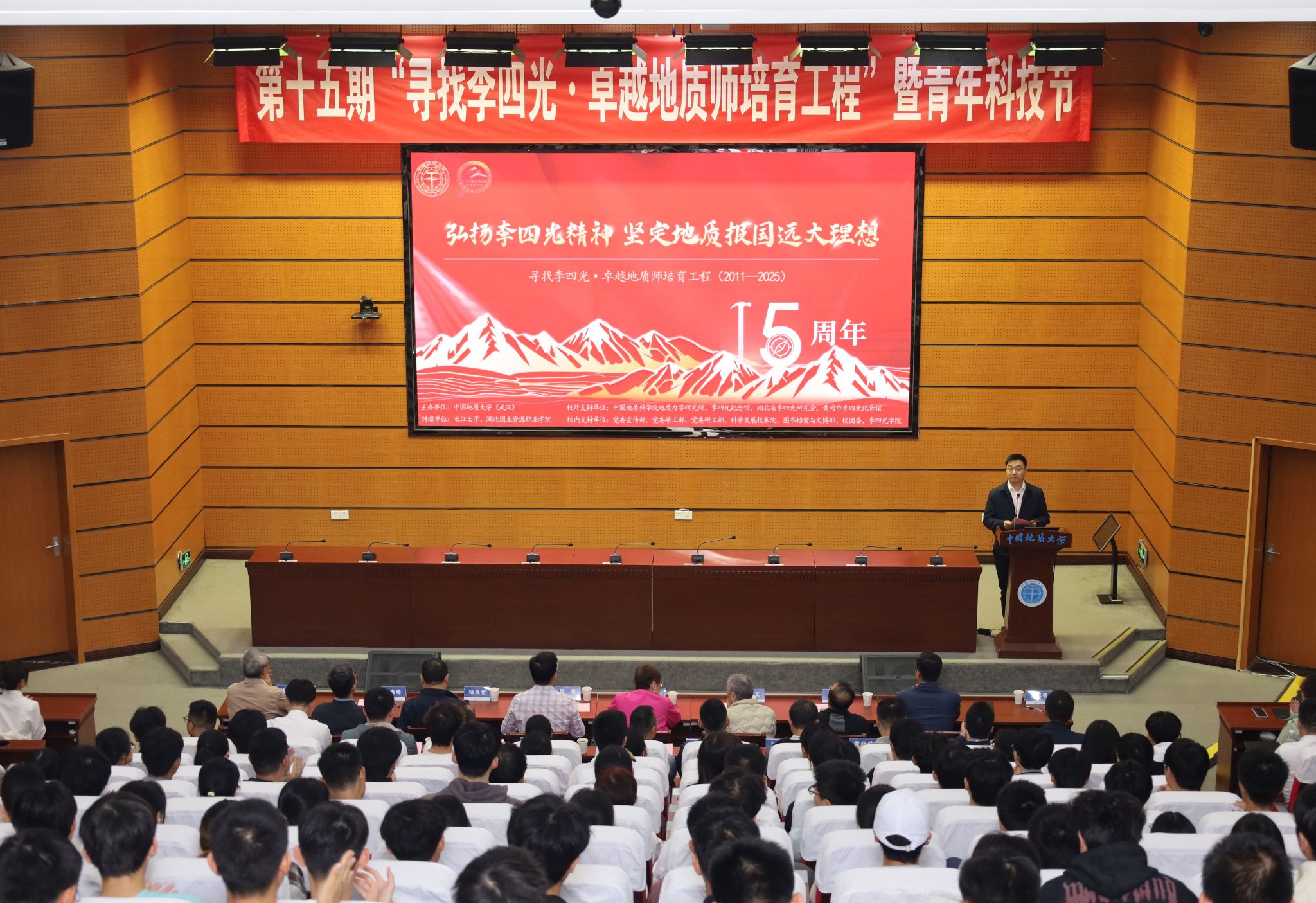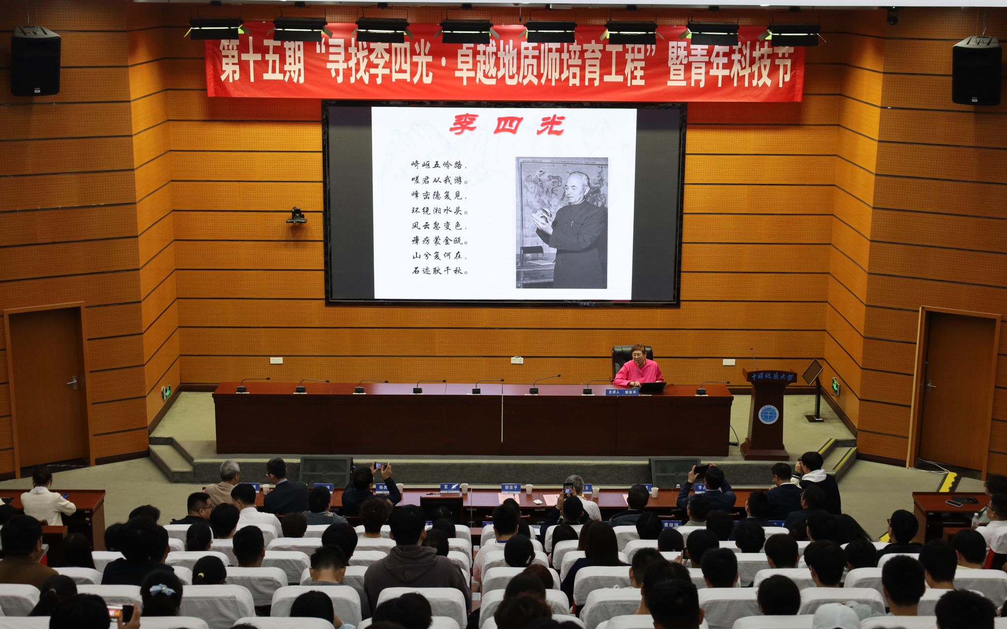 在南望山校区东教楼A0113教室举行第十五期“寻找李四光·卓越地质师培育工程”开幕式暨“李四光精神”报告会。中国科学家精神宣讲团成员、李四光纪念馆高级顾问、李四光先生外孙女邹宗平女士,李四光纪念馆黄启文先生,湖北省李四光研究会副秘书长、湖北省地质跳高高电子研究