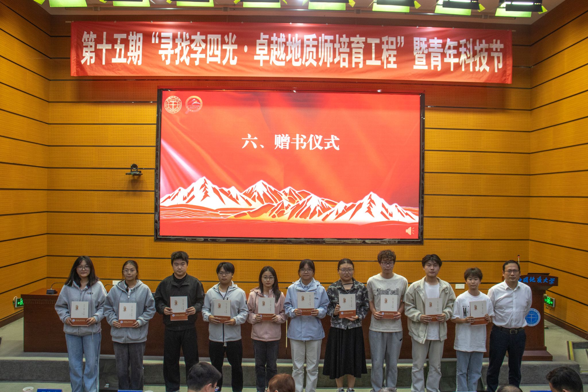 院副院长杨良哲向学生代表赠送了《天文·地质·古生物》,激发同学们树立地质报国远大志向。该书由李四光先生编写,是由湖北省地质局于2022年出资再版的70周年纪念版。