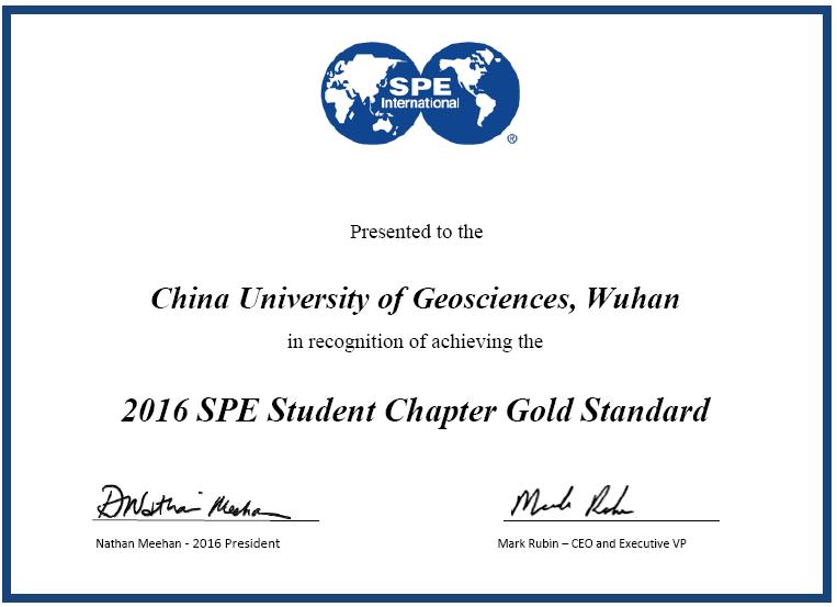 (武汉)SPE-CUG学生分会2016年度“Gold Standard”荣誉称号。此称号是该组织授予学生分会的最高荣誉。