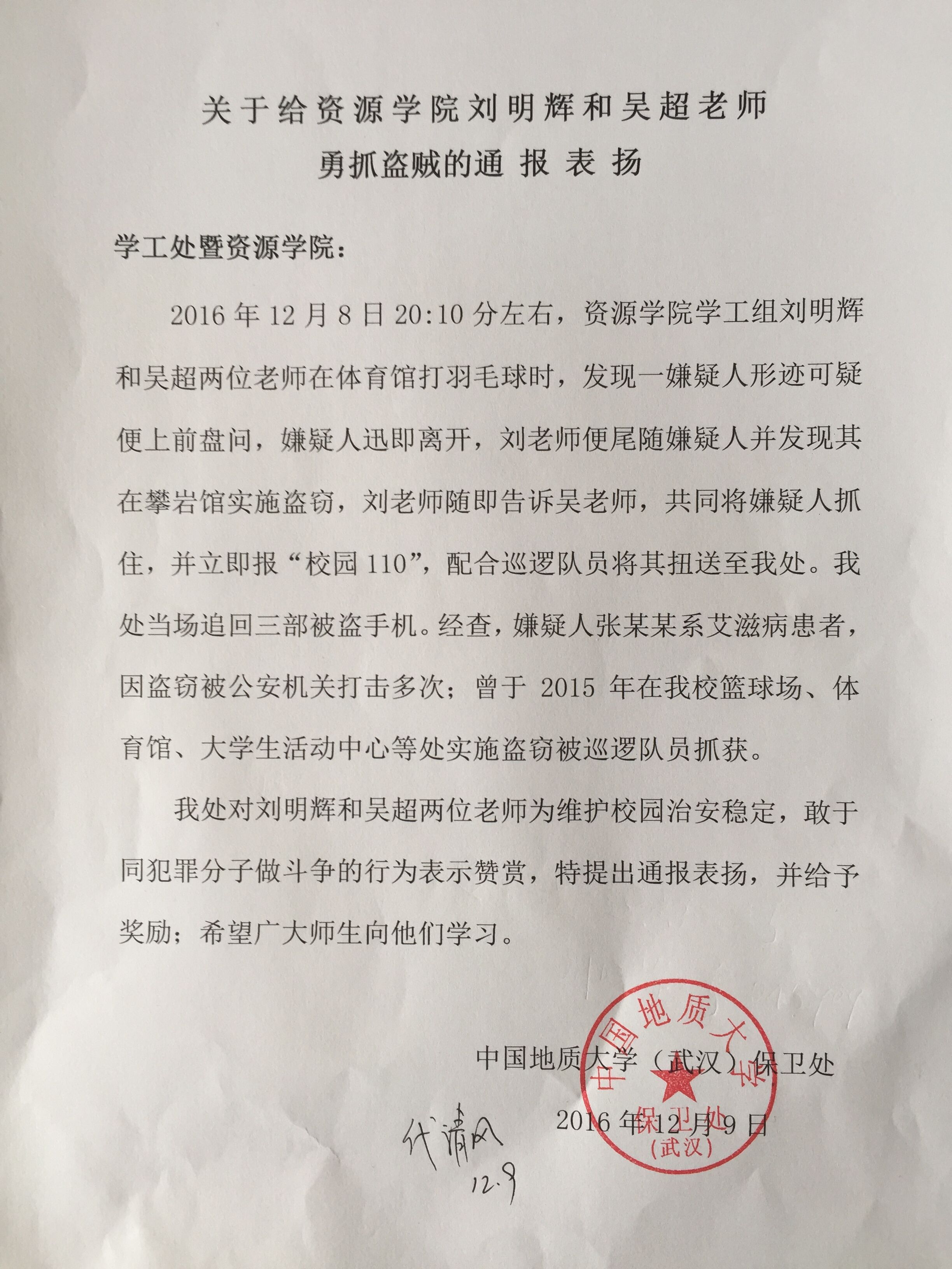 校保卫处对刘明辉和吴超两位老师为维护校园治安稳定,敢于同犯罪分子做斗争的行为表示赞赏,特提出通报表扬,并给于奖励,希望广大师生向他们学习。
