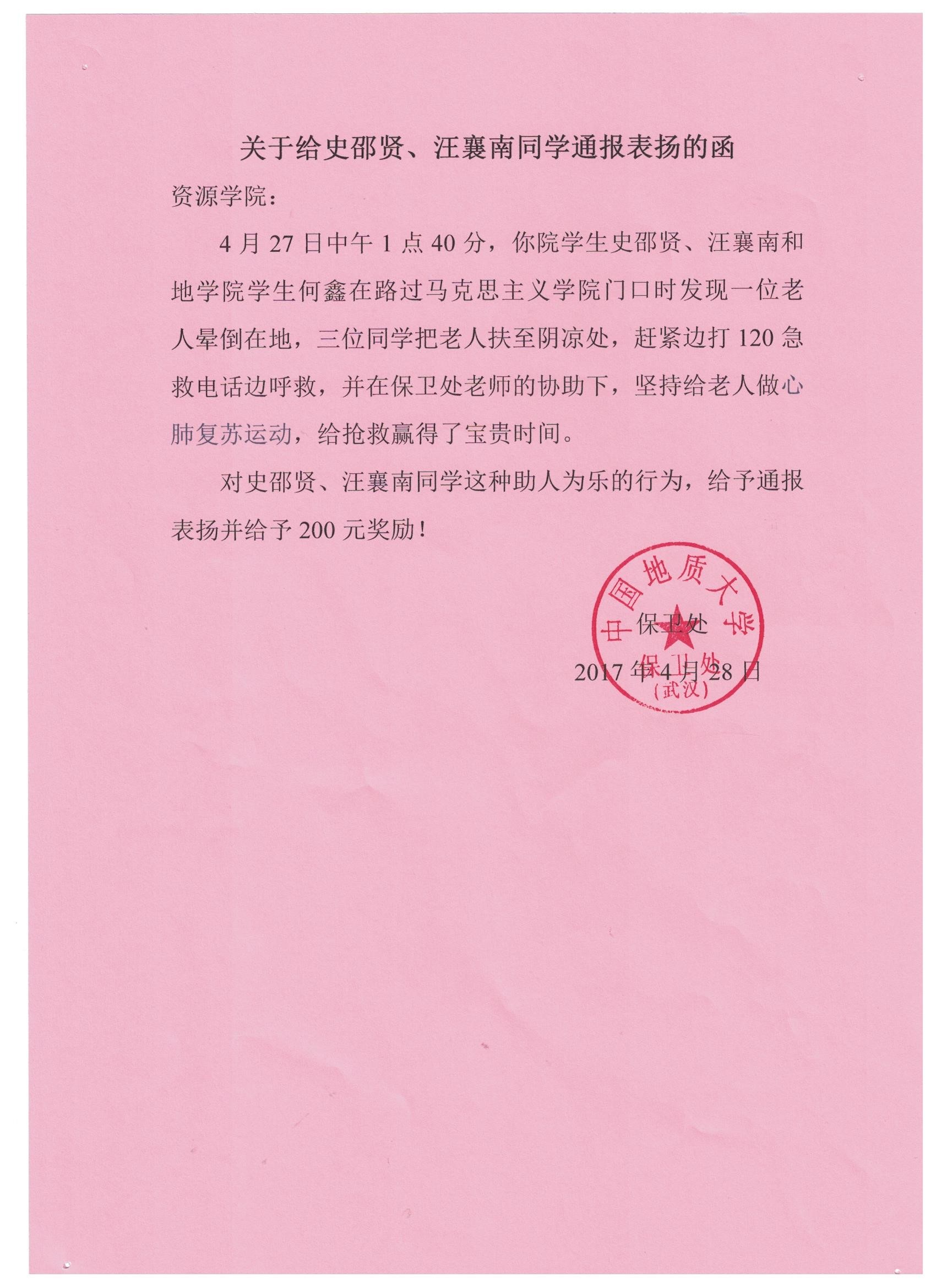 党委关于给予史邵贤、汪襄南两位同学表扬的通报