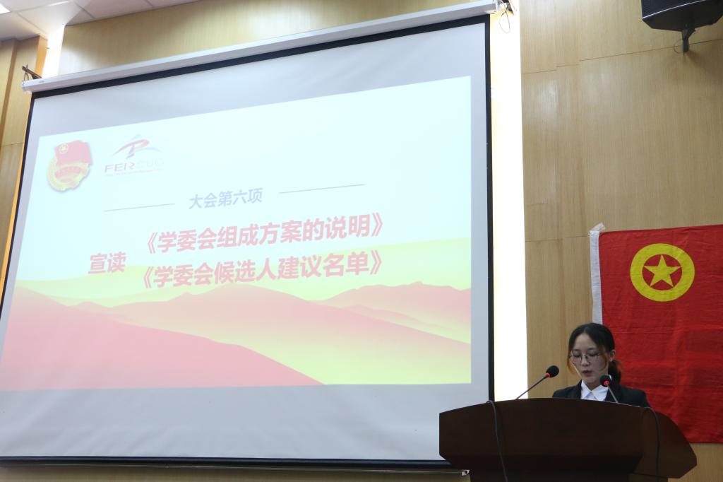 大会主席团成员、院学生会副主席陶欢宣读《学委会组成方案的说明》和《学委会候选人建议名单》。