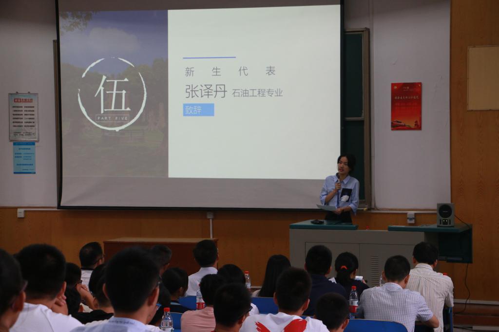 本科生新生代表张译丹发言,她表示将端正态度、好好学习;做好定位、智慧取舍;宽容换位,和谐相处,带着对知识的渴望和对新生活的向往在地跳高高电子