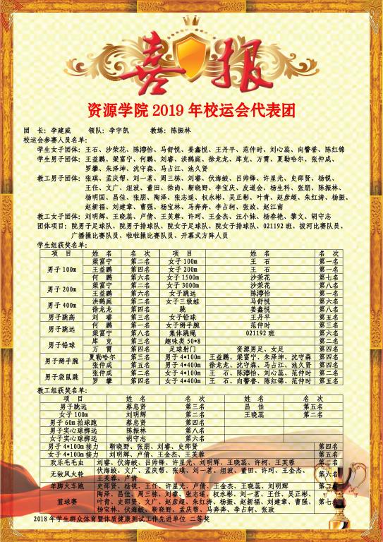 在三天的激烈竞争中,资源健儿们秉承着“更高、更快、更强”的体育精神在赛场上奋力拼搏,不断超越,最终取得了总成绩学生组男子团体第一名,女子团体第四名,教工组男子团体第六名,女子团体第六名的优异成绩,传承了跳高高