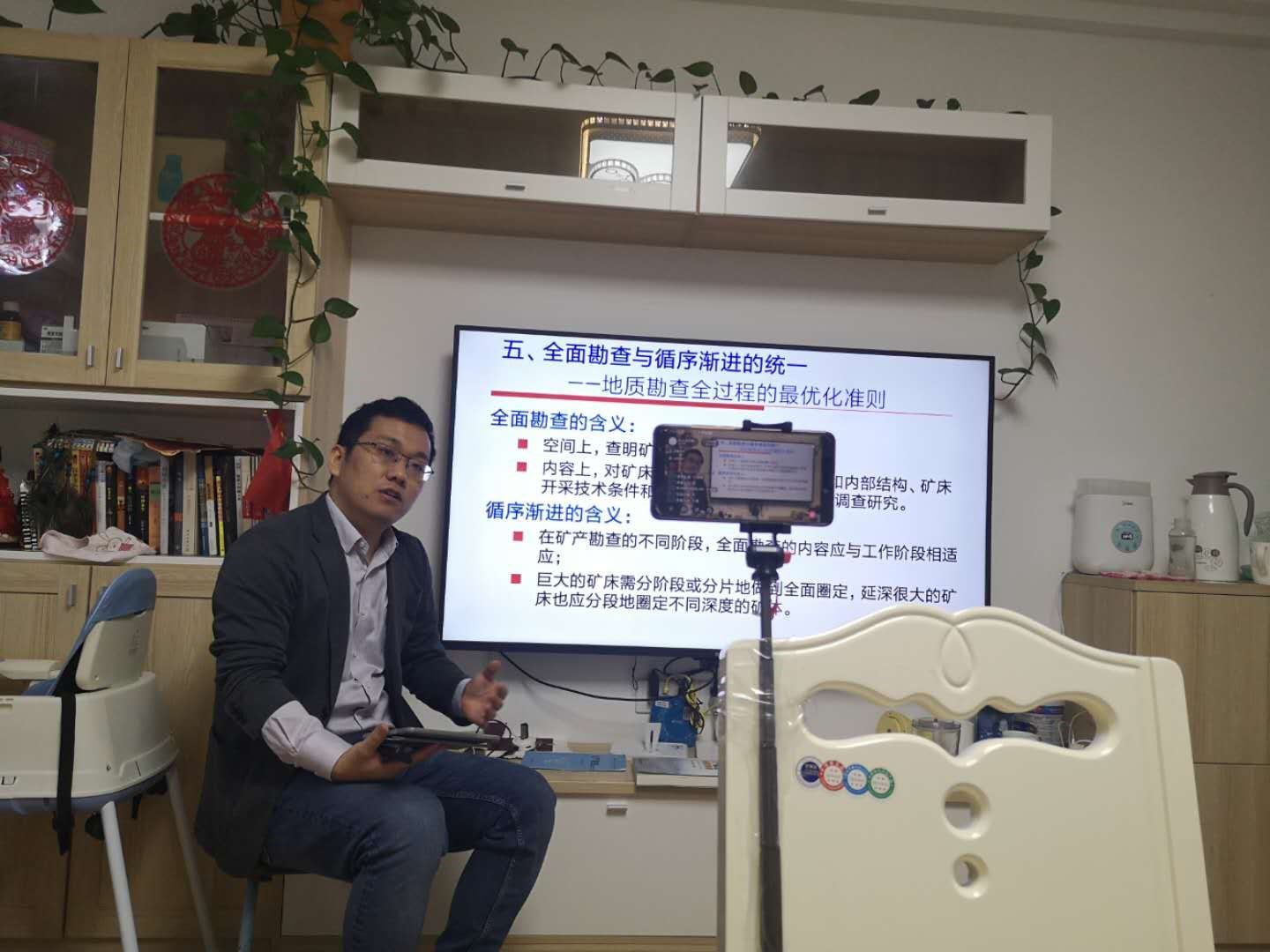 《矿产勘查理论与方法》主讲教师刘文浩巧借家中已有的工具和设备,成功地当上了学生们的“网红”。他将电视机变成黑板,把手机固定在自拍杆上,用哔哩哔哩平台进行直播授课,手中的IPAD可以随时查看直播状况,也可以通过弹幕提问的方式增进师生互动。由于直播平台信号稳定,电视机画面清晰,刘老师讲课也提纲挈领、风趣幽默,因此收获了学生们的一致好评。