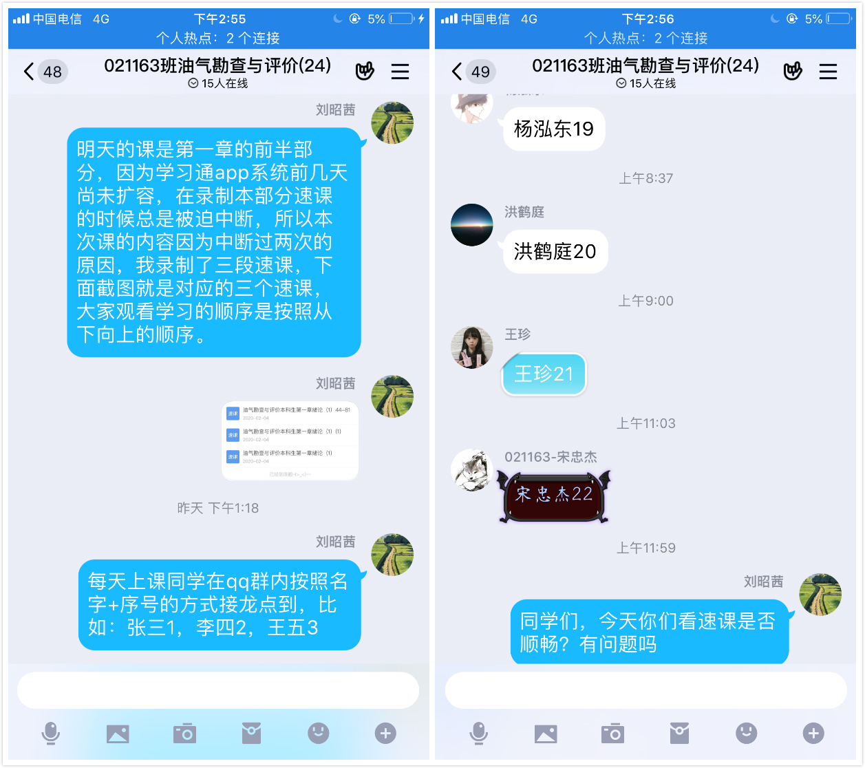 石油地质系刘昭茜老师,长期负责资源勘查工程专业《油气勘查与评价》课程的课堂教学工作。本次疫情中,经过与教学组成员讨论后,最终确定采取基于教学班QQ群的学生沟通管理和基于超星学习通APP线上速课的形式开展教学。在未带最新版的课件和教材、没有wifi、没有电脑的困难情况下,通过借用他人修改老版本课件,利用手机解决网络,实现课程网络教学的顺利开展。