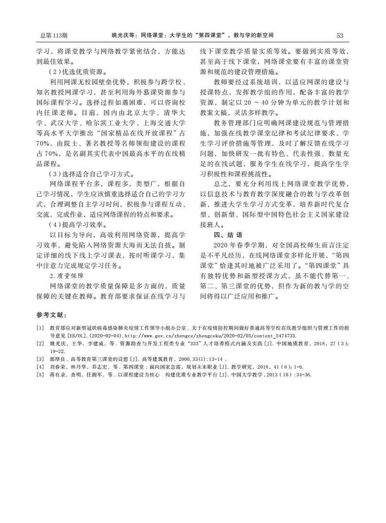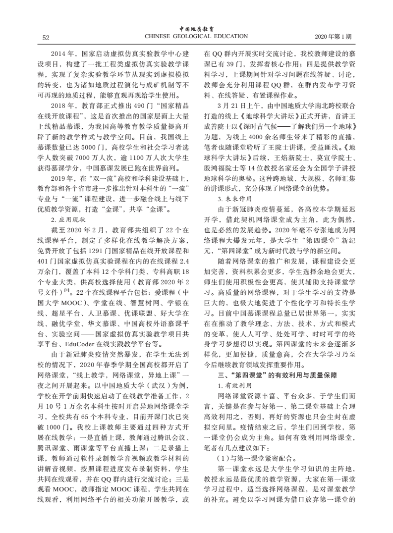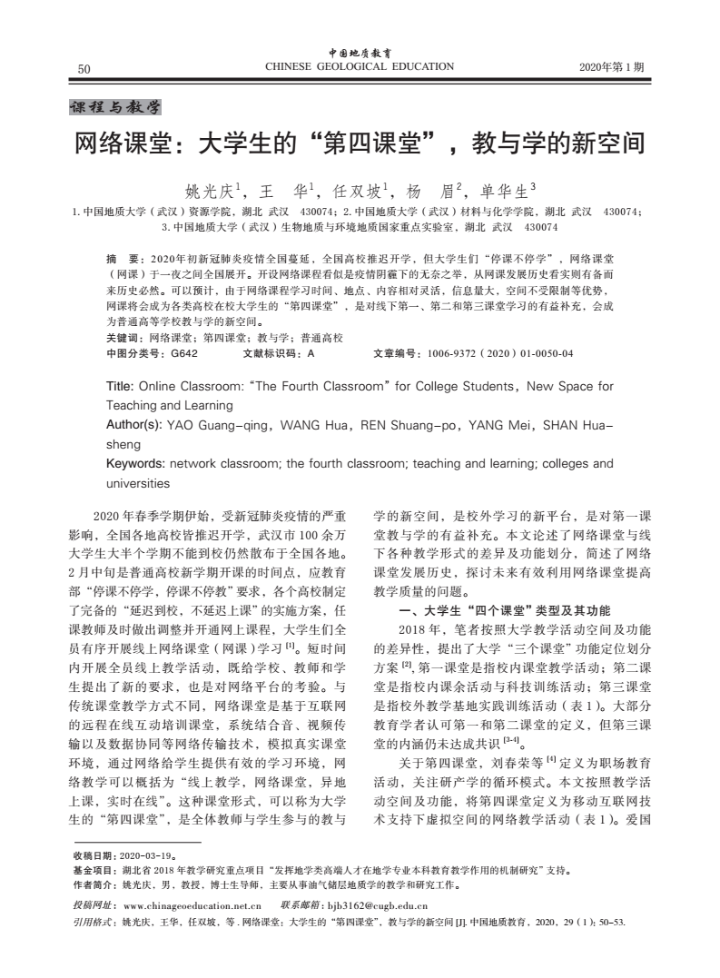 编者按:当前,新冠肺炎疫情蔓延势头得到有效遏制,防控工作取得阶段性成效,为深入贯彻落实习近平总书记关于统筹推进疫情防控和经济社会发展的系列重要讲话精神,在跳高高 统一部署下,跳高高 全体教师克服重重困难,创新运用线上教学新形式,积极总结教学经验与成果。《线上教学进行时》第十期,让我们一同了解姚光庆,王华,任双坡等五位教师发表在《中国地质教育》期刊上的文章《网络课堂:大学生的“第四课堂”,教与学的新空间》。