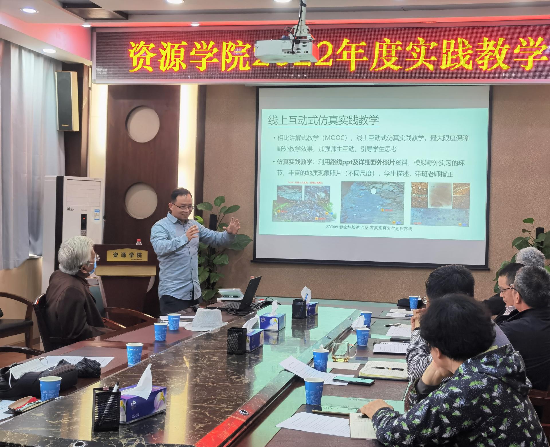 董田、魏启荣、李嘉光、杨振、顾军和陈振林等6位实习基地教学团队负责人汇报了2021年度实践教学基本情况及取得的建设成果和亮点,也对2022年实践教学安排进行了规划。与会人员就各实习基地的实践教学实施、创新人才培养、教学模式创新、教学方法改进、实习教师队伍建设等方面进行了热烈的讨论,并提出了建设性意见,指出:基地的实践教学不仅要培养学生的基本地质技能,更要增强学生对地质工作的认识和热爱,要从“专业化、兴趣化、趣味化、社会化”等方面对学生进行引导和培养;实习过程中既要学习现场观测、绘图、记录等获取一手数据的基本技能,也应和高科技结合,引入现代化的技术手段,如数字填图、无人机、虚拟现实等新技术、新设备支持实践教学工作,不断提高学生服务现代化地质工作的能力;实践教学团队也应持续加强教学路线、实习教材、虚拟仿真课程等教学资源建设。讨论结束后,与会人员对实践教学团队2021年的工作进行了测评。