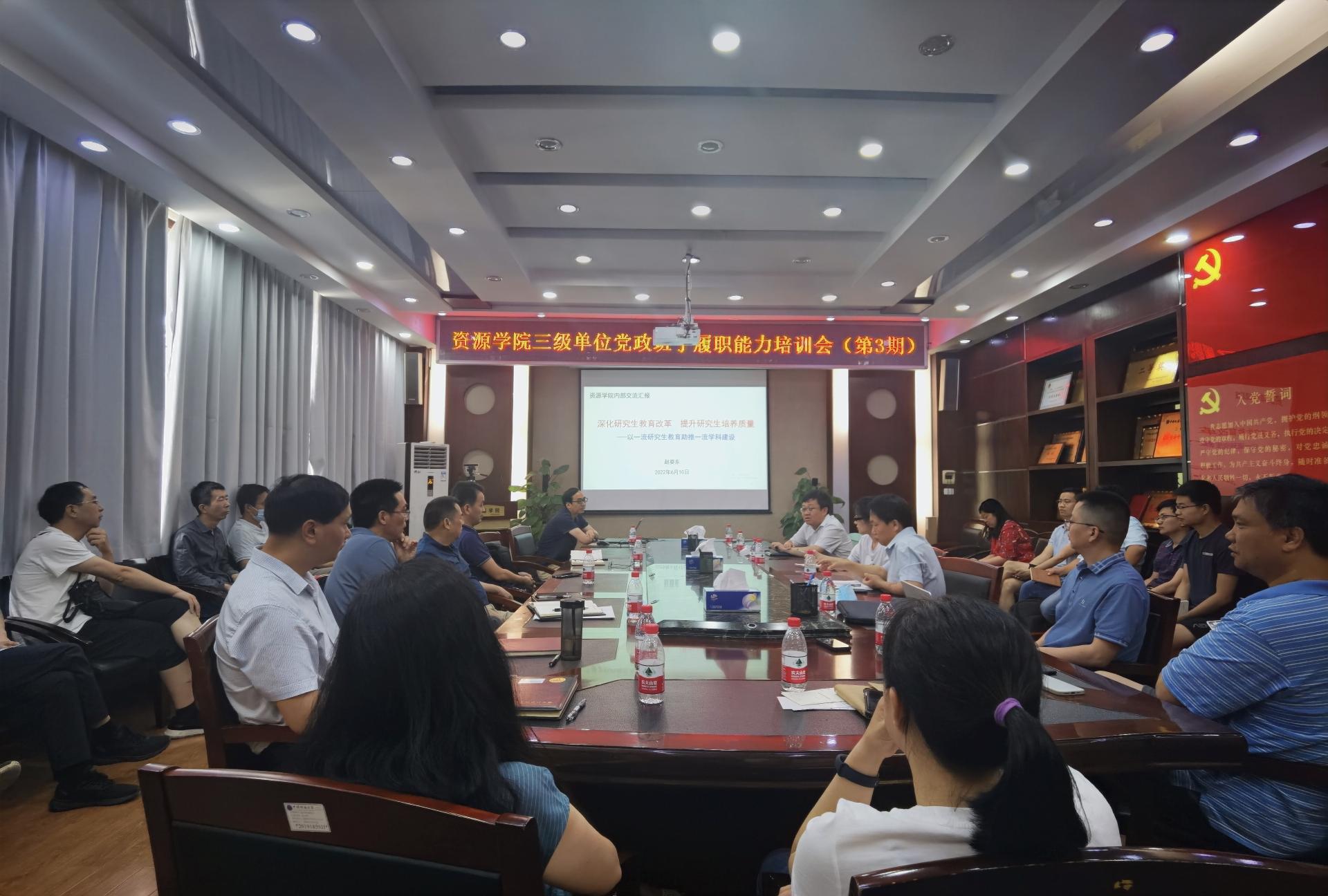 三级单位党政班子履职能力培训班第三期培训在主楼330报告厅举行。副院长严德天、赵葵东分别授课,各三级单位党政班子成员及院直全体人员参加培训,党委书记高复阳主持会议。