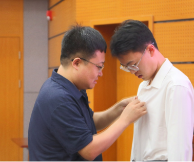 党委书记高复阳在开学典礼上为2021级本科新生佩戴院徽
