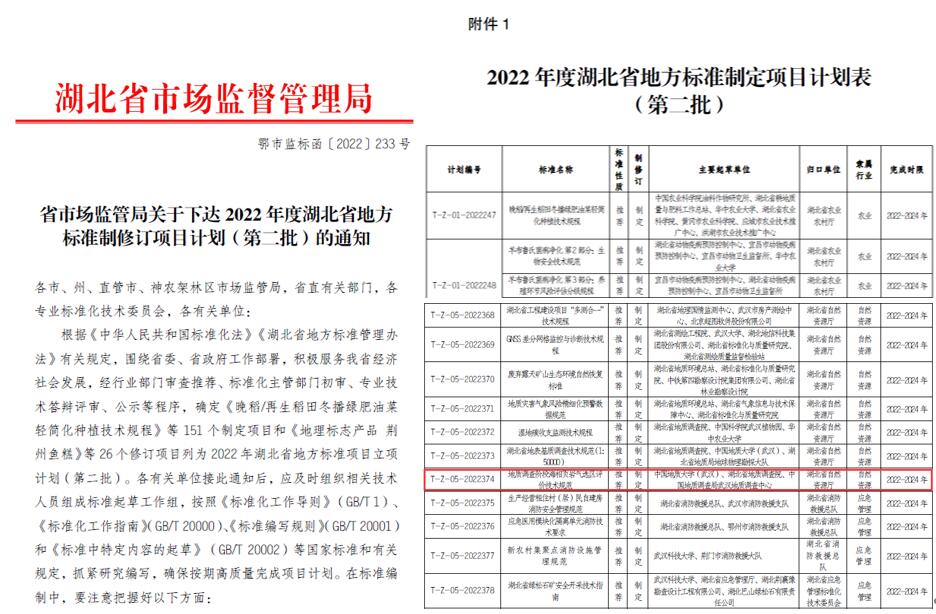 石万忠教授牵头,联合湖北省地质调查院及中国地质调查局武汉地质调查中心联合起草的《地质调查阶段海相页岩气选区评价技术规范》获批湖北省地方标准制定项目。