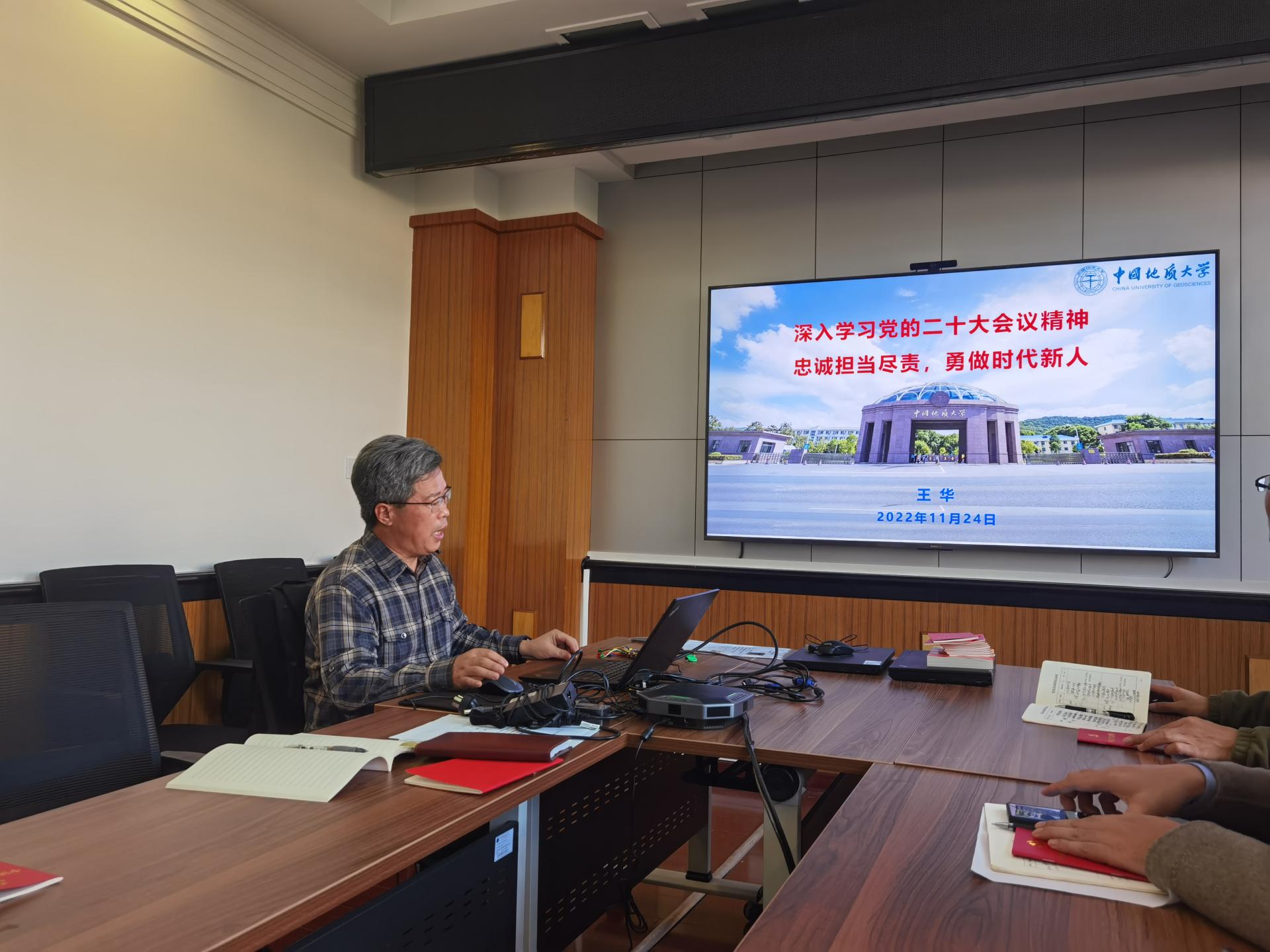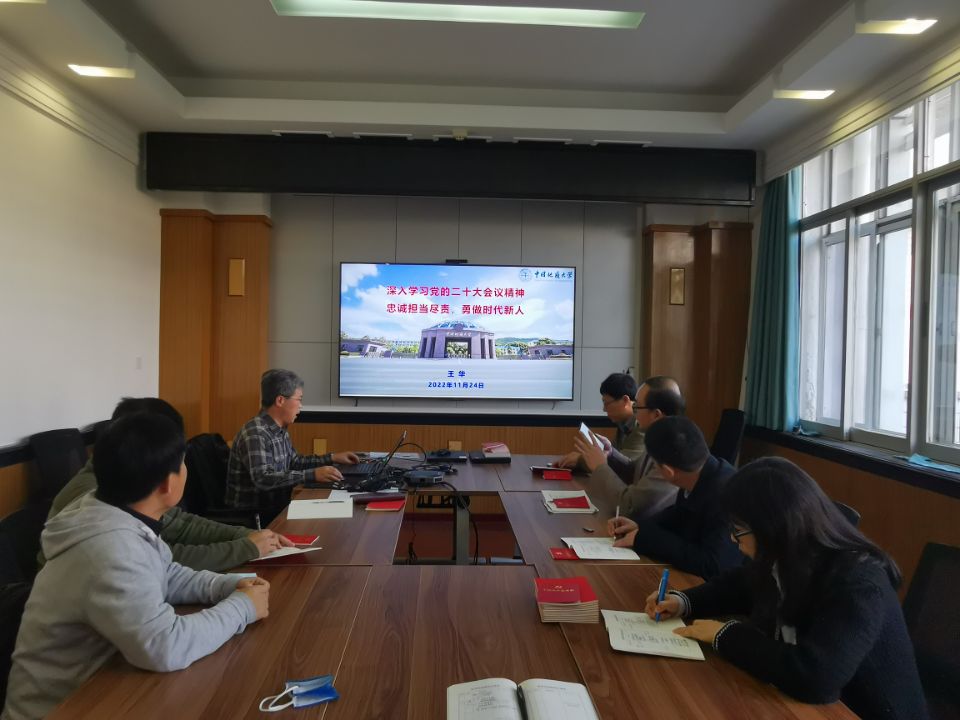 盆地矿产系党支部全体党员作党的二十大精神辅导报告。盆地矿产系支部书记王小明同志主持会议。