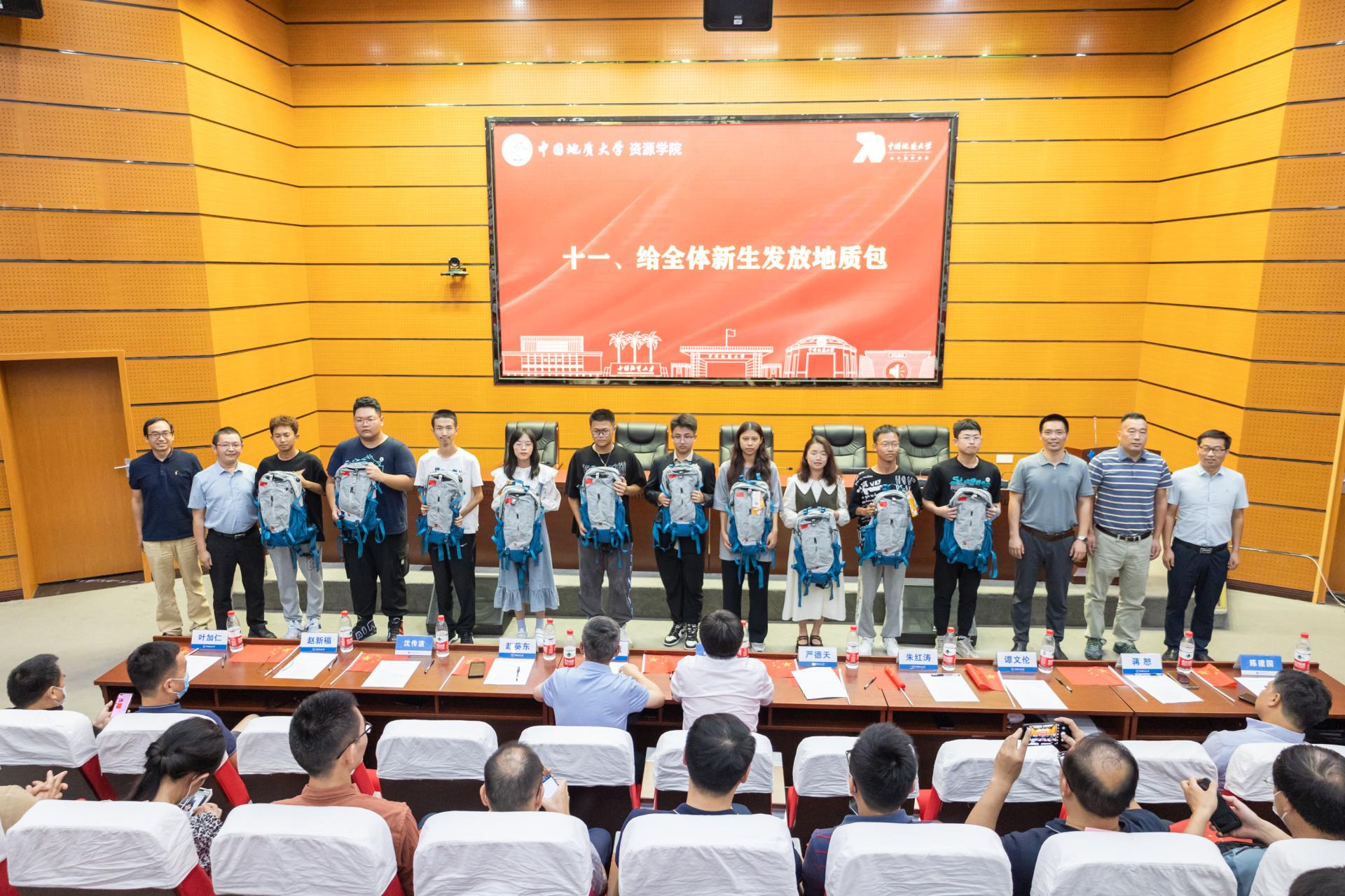 院领导为新生发放地质包