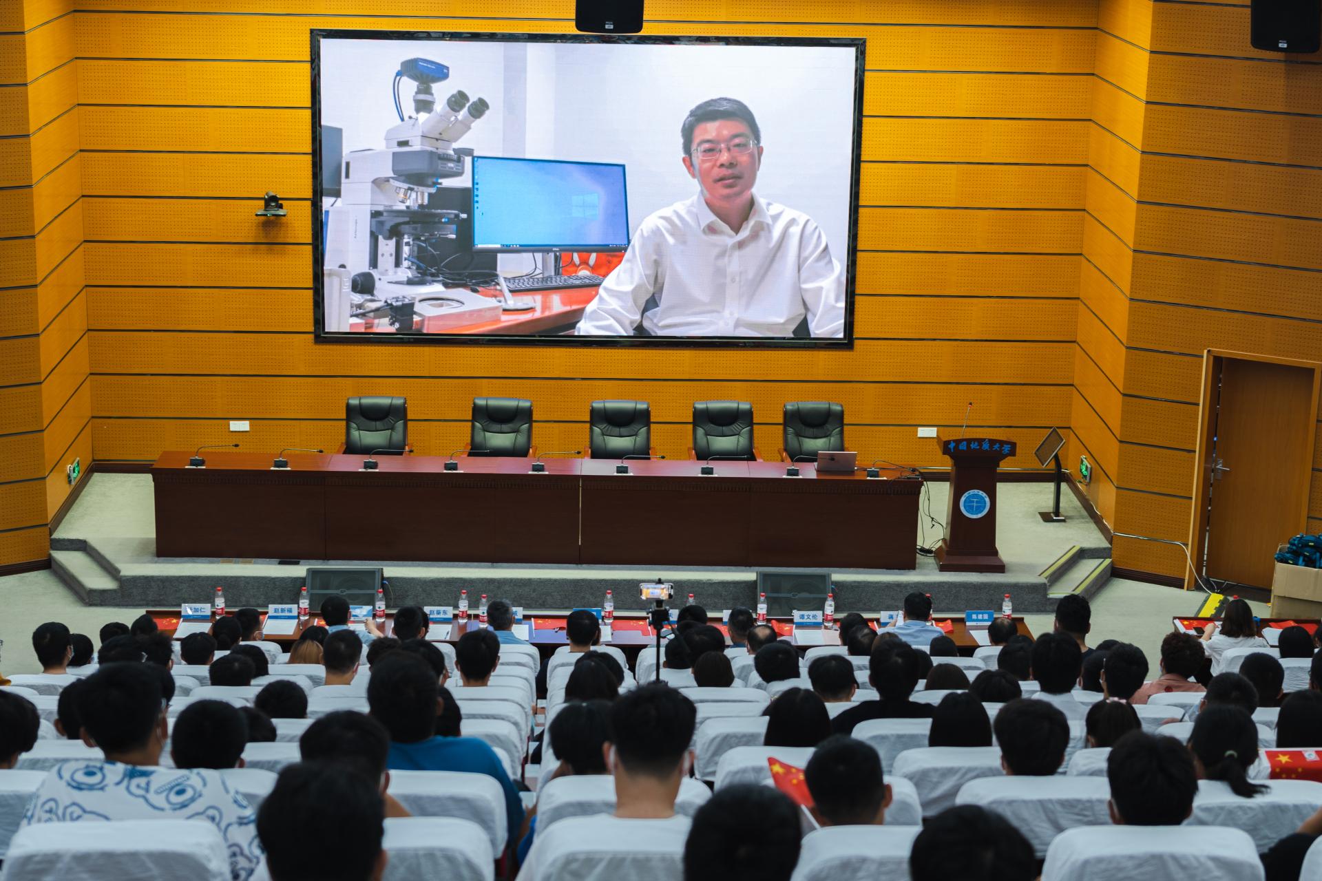 资源勘查工程专业2004届校友、中石油勘探开发研究院致密油研究所副所长、国家“万人计划”入选者杨智教授通过线上方式为同学们送上祝福。他深情回忆了自己在地大9年的求学时光,勉励同学们珍惜求学时光,感恩师长好友;学习专业知识,拓展综合素质;脚踏实地,仰望星空。希望同学们“干”字当头、“实”字托底、事不避难、力戒浮华,做求实奋进的新时代资源人。