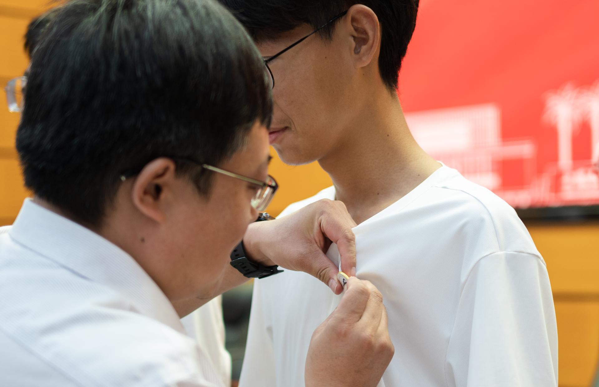院党委书记高复阳为新生代表佩戴院徽。