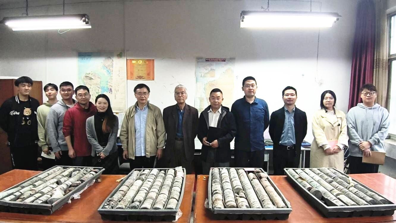 含油气盆地沉积学课程针对新采购的盐湖背景下多旋回泥岩-膏盐岩岩心开展现场教学,杨香华教授带领课程组教师和学生代表观察多旋回泥岩-膏盐岩岩心,讲解岩心观察的方法和步骤,总结岩心的发育特点和意义。