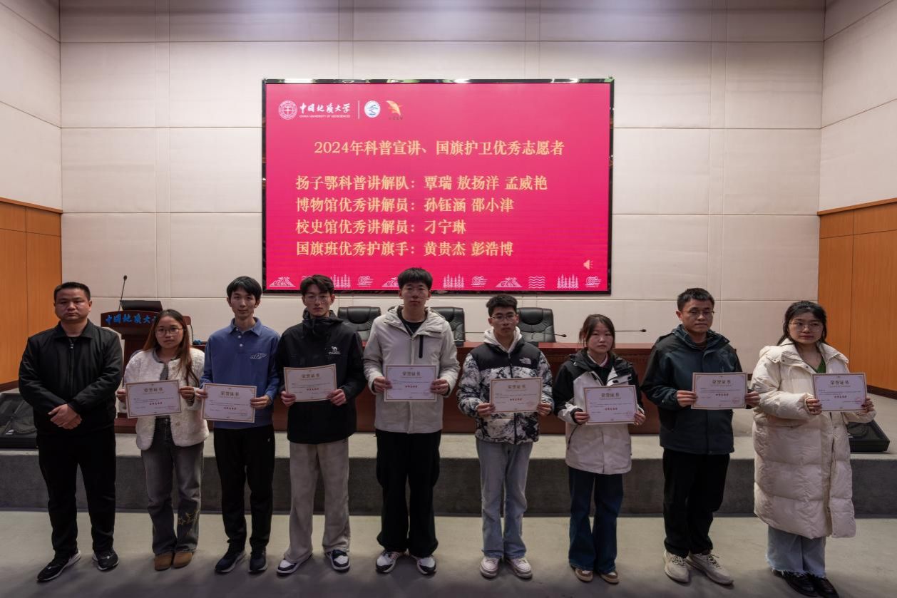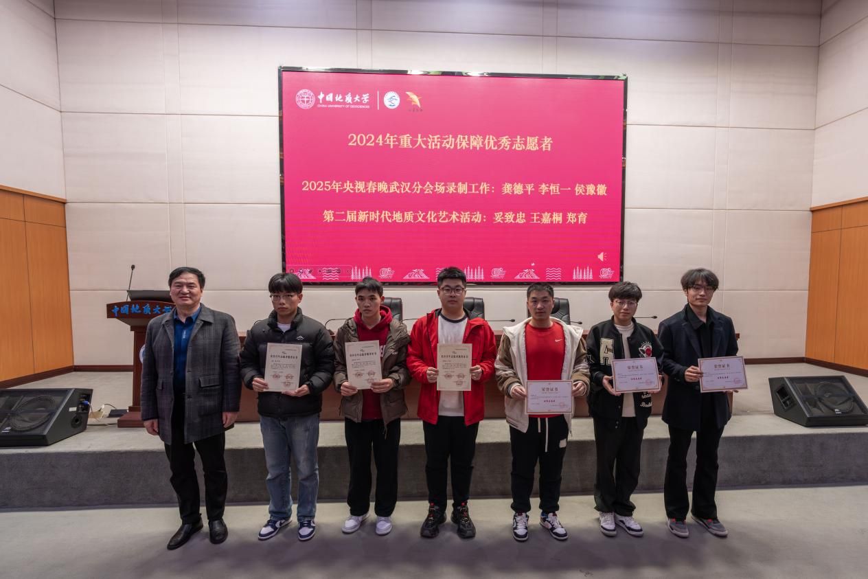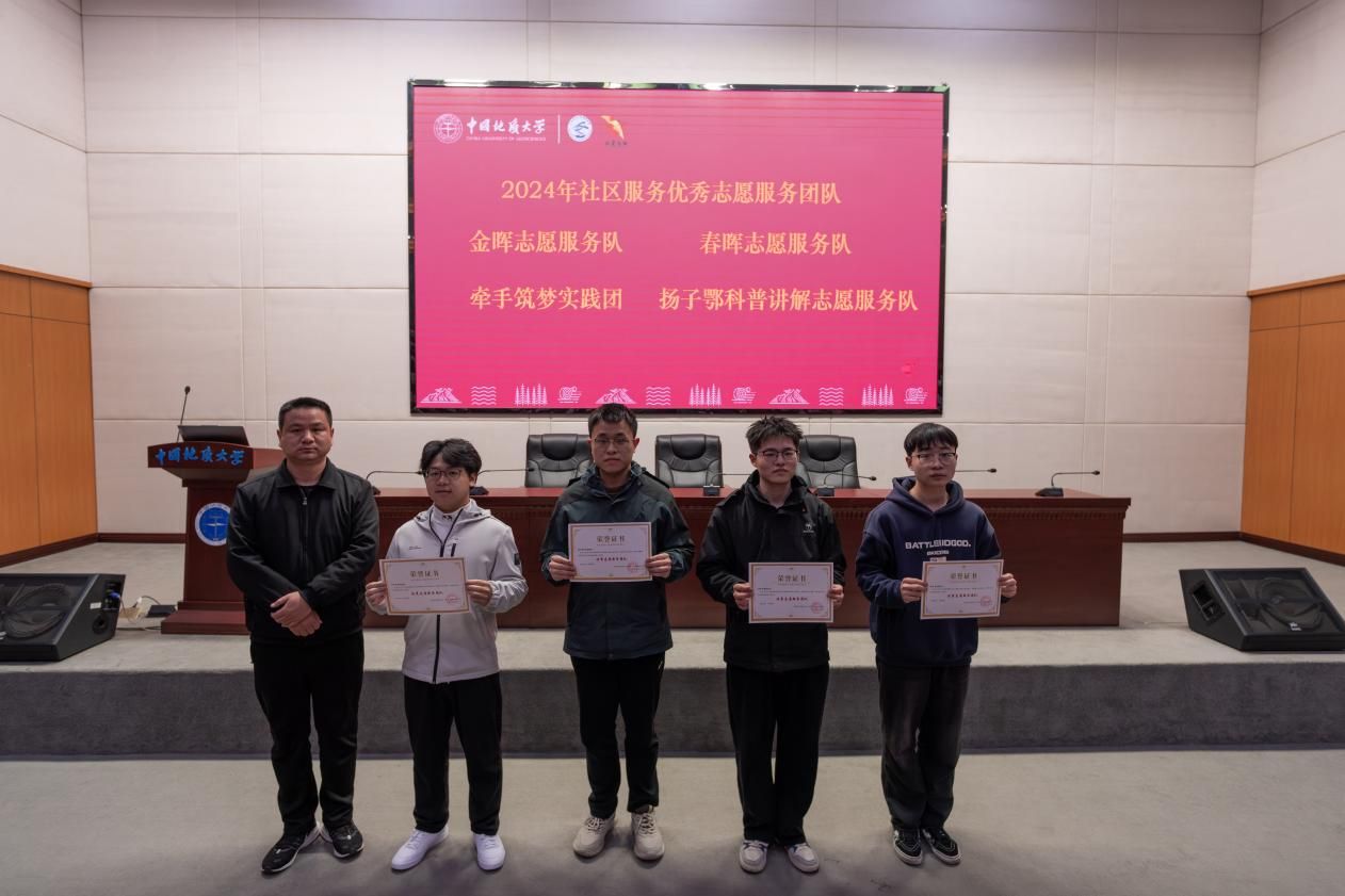 表彰环节,吴红莉为2024年社区服务优秀志愿者颁奖,李靖为2024年社区服务优秀志愿服务团队和科普讲解、国旗护卫优秀志愿者颁奖,张宽裕为在第二届全国地质文化艺术节、2025年蛇年春晚武汉录制会场优秀志愿者颁奖。