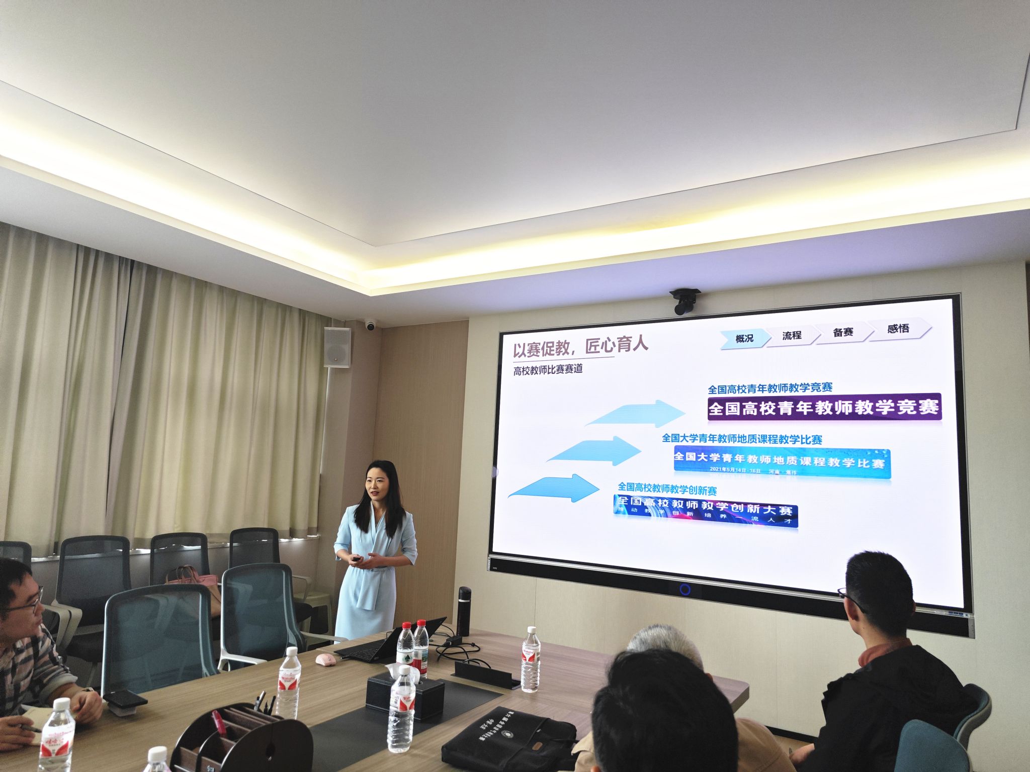 设立“资源教育教学论坛”的背景和意义,并介绍了陈思老师的教学和获奖经历。陈思老师以“从青教赛到优课堂——教学能力提升的进阶之路”为题作报告,从“以赛促教,匠心育人”和“以建促学,优课铸魂”两方面分享了青教赛经验和课程建设经验。她总结青教赛的进阶路径分为5步:强化教学设计、打磨教学细节、提升语言艺术、形成教学风格、从容应对教学节段抽选,可以从双语教学、AI赋能、教具完备等方面进行内容提升。她谈到参加青教赛的感悟认为教学时要思考“老师到底教什么,学生到底学什么”,要以学生为中心,让学生思维“长见识”“能量转化”,面对人工智能、AI的挑战,要注重培养学生的思维更新和思辨能力。她结合自己的课程介绍了课程建设经验,重点介绍了课堂教学、实践教学、科教融合和学科交叉的课程建设方法体系。与会教师就教学投入、课程互动、教学模式优化、如何利用AI建设课程等问题与陈思老师进行了交流。湖北省教学名师徐思煌老师认为设立“资源教育教学论坛”营造了跳高高电子
