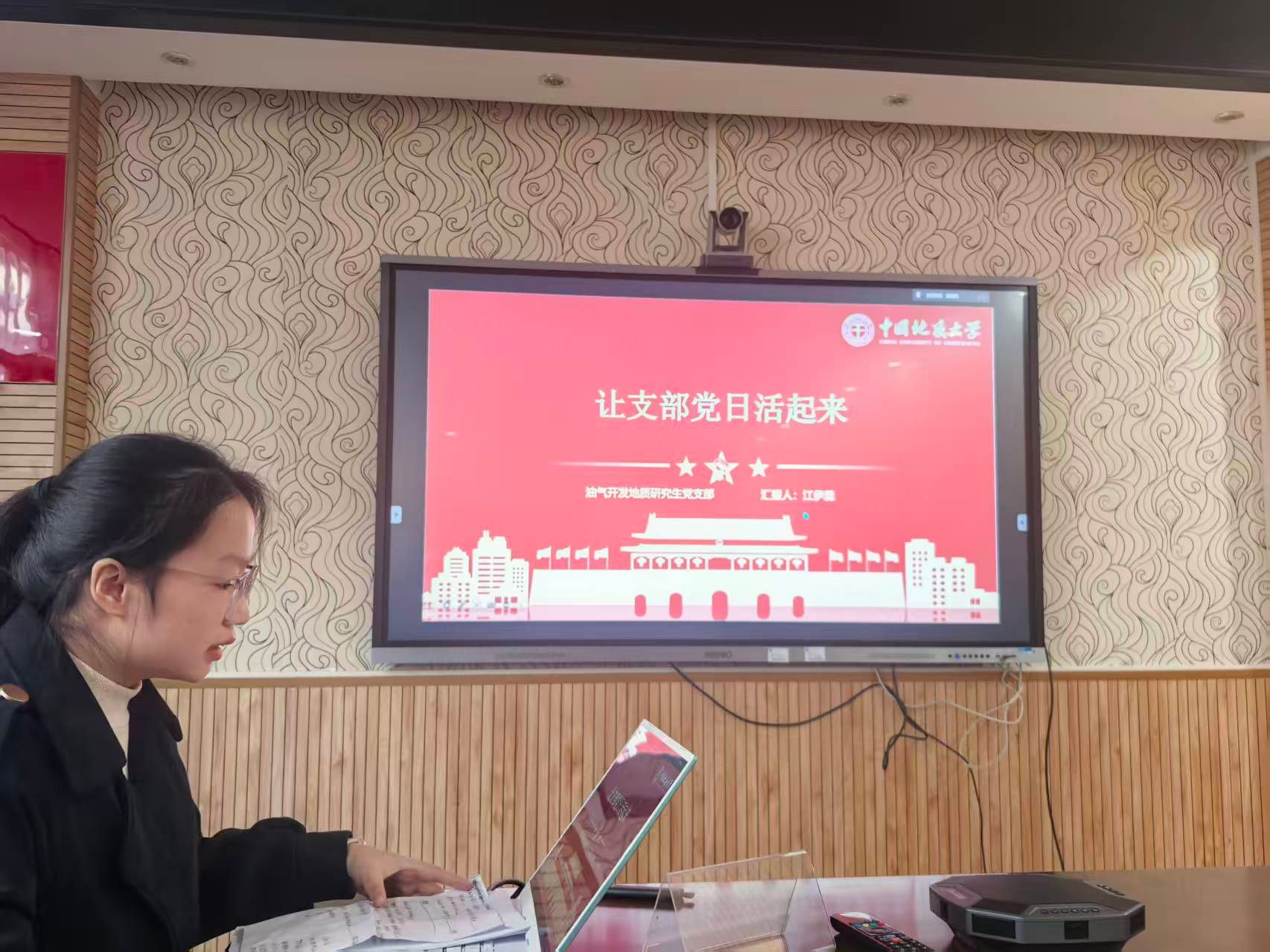 油气开发地质研究生党支部书记江伊蕊介绍支部主题党日活动经验,她以“让支部党日活起来”为题,分享了通过任务分解、过程管理和议程规范来组织党日活动的经验,确保了活动的主题聚焦、互动充分与效果持久。