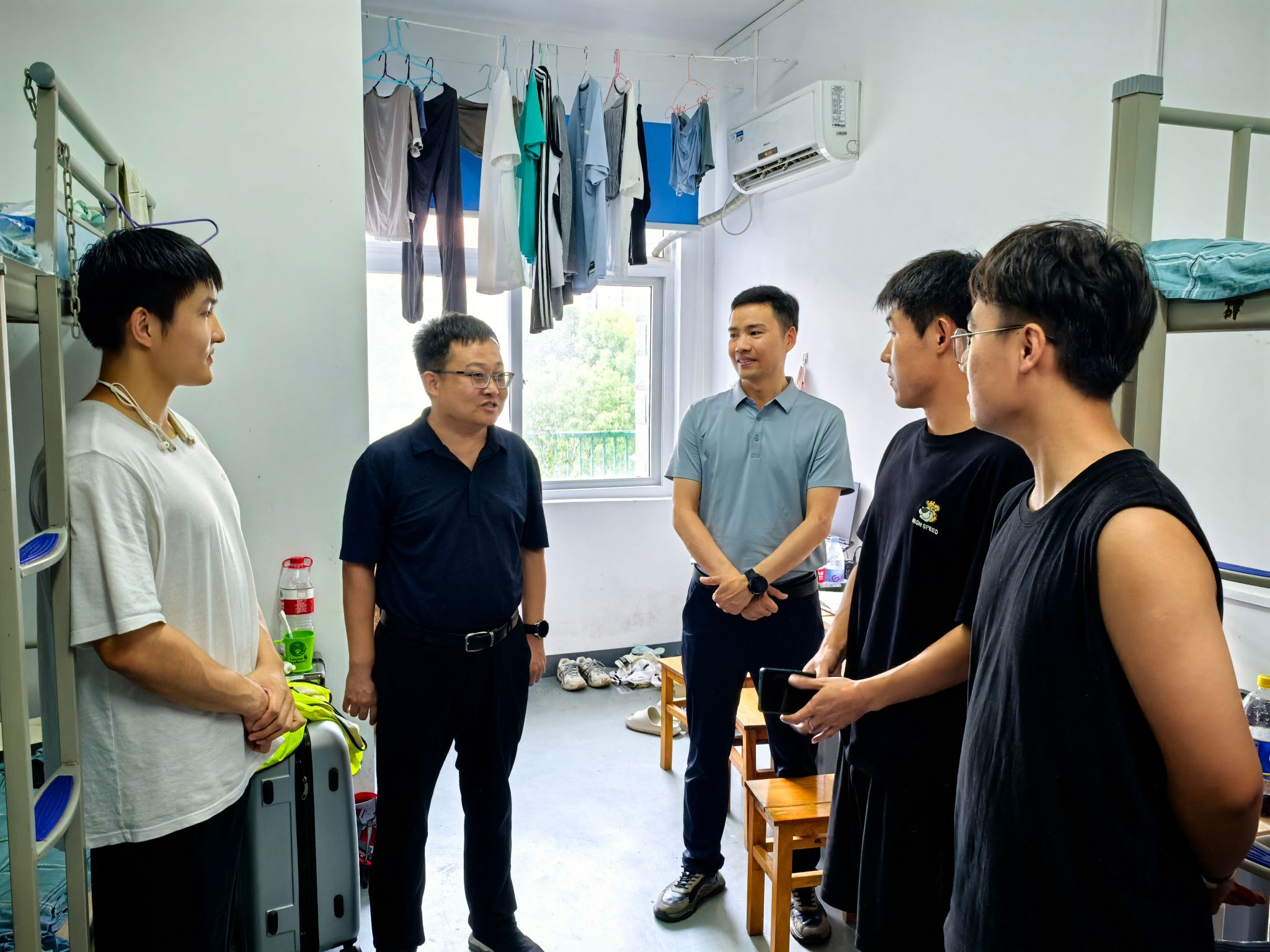 9月8日,高复阳、李占轲为师生发放慰问品,并到教师宿舍、学生宿舍看望师生。他们代表跳高高电子 向参加实习的所有老师致以节日的问候,向扎实做好野外备课和实践教学的教学团队表示感谢,叮嘱教学团队把实习安全放在首位,鼓励全体教师在教学过程中增强野外实践教学的“地方味”“文化味”“思政味”,上好新时代地质专业实践教学的“大思政课”;详细询问了同学们在实习期间的成长与收获,勉励大家要弘扬地质工作者优良传统,坚定地质报国志向,保持勤学好问、刻苦钻研的劲头,努力成长为国家资源能源领域优秀创新人才。