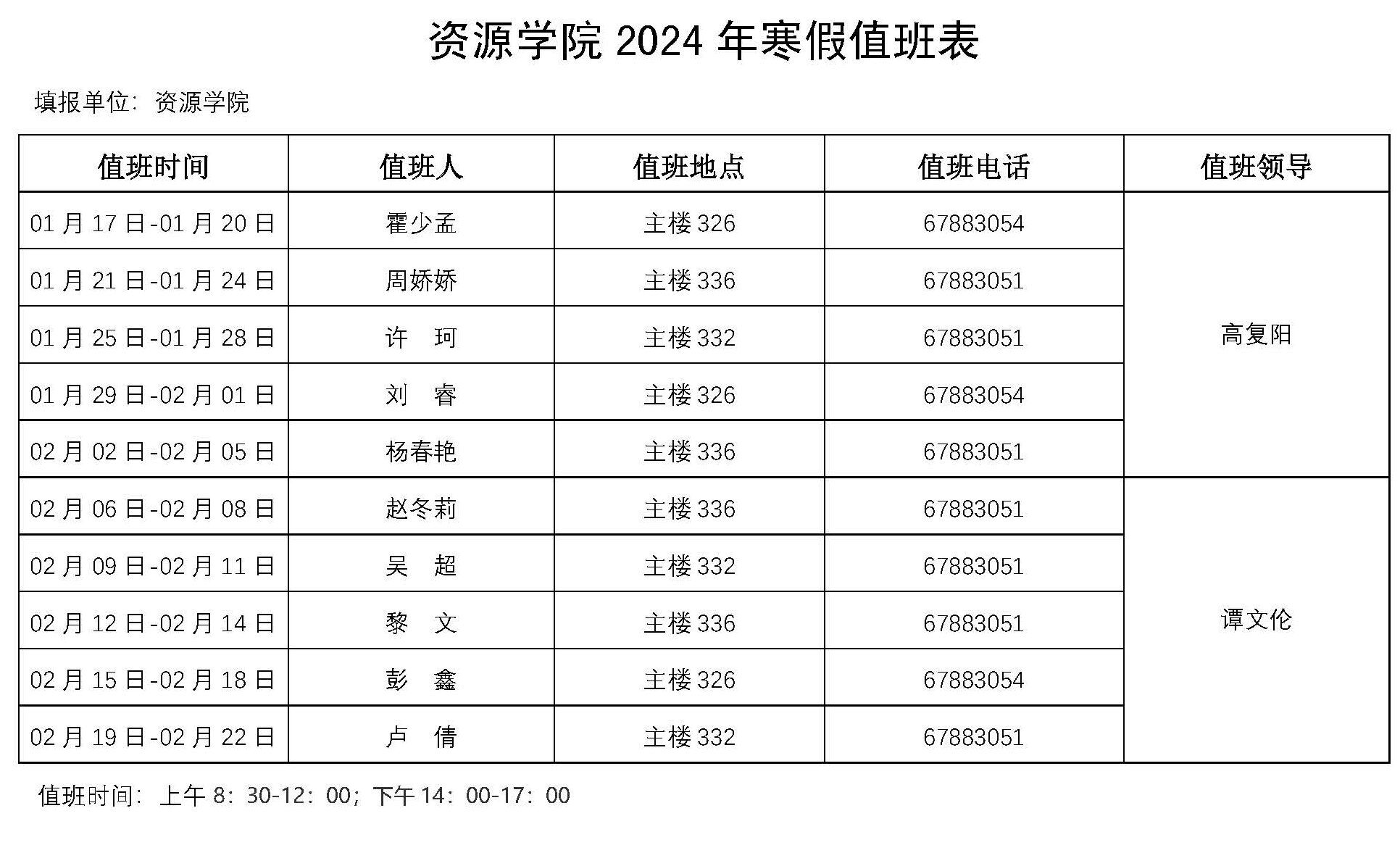跳高高 2024年寒假值班表