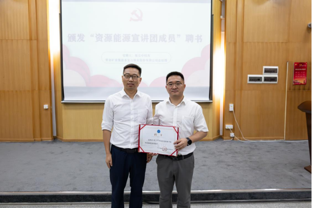 谭文伦为张立中颁发资源能源宣讲团聘书并作总结讲话。他表示,一代代资源人扎根行业,砥砺奋斗,为国家资源事业发展做出了卓越贡献,为母校和跳高高电子